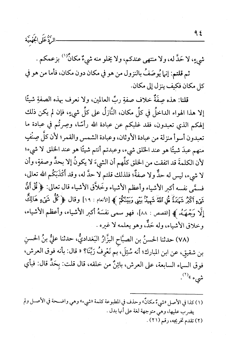 قلنا: هذه صِفَةٌ خلاف صفةِ ربِّ العالمين، ولا نعرف بهذه الصفةِ شيئًا إلا هذا الهواء الداخلُ في كلِّ مكان، النَّازلُ على كلِّ شيءٍ، فإن لم يكن ذلك إلهكم الذي تعبدون، فقد غلبكم عن عبادة الله رأسًا، وصِرتُم في عبادة ما تعبدون أسوأ منزلة من عبادة الأوثان، وعبادة الشمس والقمر؛ لأن كلَّ صِنْفٍ منهم عبدَ شيئًا هو عند الخَلق شيء، وعبدتم أنتم شيئًا هو عند الخلق لا شيء؛ لأن الكلمةَ قد اتفقت من الخلق كلِّهم أن الشيءَ لا يكونُ إلا بحدٍّ وصفةٍ، وأن لا شيء، ليس له حدٌّ ولا صفةٌ؛ فلذلك قلتم لا حدَّ له، وقد أَكْذَبَكُم الله تعالى، فسمَّى نفسه أكبر الأشياء وأعظم الأشياء وخَلاَّق الأشياء قال تعالى: {قُلْ أَيُّ شَيْءٍ أَكْبَرُ شَهَادَةً قُلِ اللَّهُ شَهِيدٌ بَيْنِي وَبَيْنَكُمْ} [الأنعام: 19] وقال {كُلُّ شَيْءٍ هَالِكٌ إِلَّا وَجْهَهُ} [القصص: 88]، فهو سمى نفسَهُ أكبر الأشياء، وأعظم الأشياء، وخلاق الأشياء، وله حَدٌّ، وهو يعلمه لا غيره.
