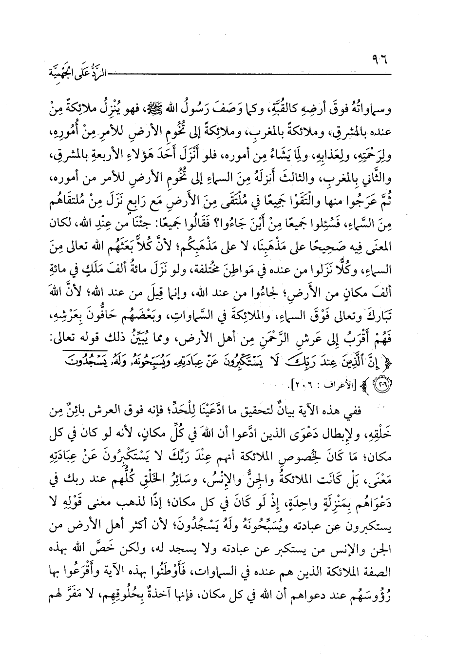ففي هذه الآية بيانٌ لتحقيق ما ادَّعَيْنَا لِلْحَدِّ؛ فإنه فوق العرش بائِنٌ مِن خَلْقِهِ، ولإِبطال دَعْوَى الذين ادَّعوا أن اللهَ في كُلِّ مكانٍ، لأنه لو كان في كل مكان؛ مَا كَانَ لِخُصوصِ الملائكة أنهم عِنْدَ رَبِّكَ لا يَسْتَكْبِرُونَ عَنْ عِبَادَتِهِ مَعْنَى، بَلْ كَانَت الملائكةُ والجِنُّ والإِنْسُ، وسَائِرُ الخَلْقِ كُلُّهم عند ربك في دَعْوَاهُم بِمَنْزِلَةٍ واحِدَةٍ، إِذْ لَو كَانَ في كل مكان؛ إذًا لذهب معنى قَوْلِهِ لا يستكبرون عن عبادته ويُسَبِّحُونَهُ ولَهُ يَسْجُدُونَ؛ لأن أكثر أهل الأرض من الجن والإنس من يستكبر عن عبادته ولا يسجد له، ولكن خَصَّ الله بهذه الصفة الملائكة الذين هم عنده في السماوات، فَأَوْطَئُوا بهذه الآية وأَقْرَعُوا بها رُؤُوسَهُم عند دعواهم أن الله في كل مكان، فإنها آخذةٌ بِحُلُوقِهِم، لا مَفَرَّ لهم