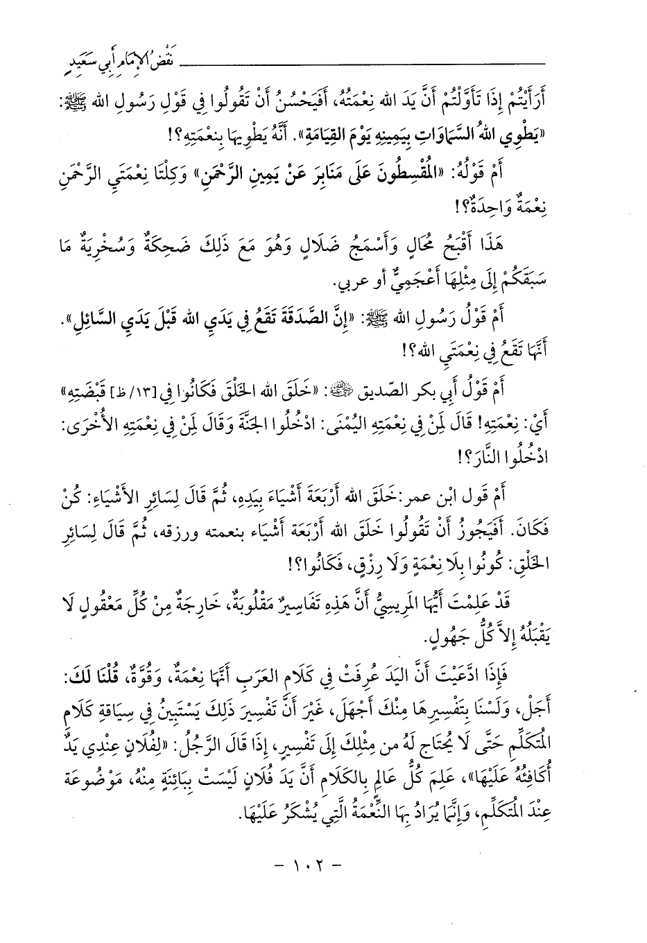 أَرَأَيْتُمْ إِذَا تَأَوَّلْتُمْ أَنَّ يَدَ الله نِعْمَتُهُ، أَفَيَحْسُنُ أَنْ تَقُولُوا فِي قَوْلِ رَسُولِ الله - صلى الله عليه وسلم -: «يَطْوِي اللهُ السَّمَاوَاتِ بِيَمِينِهِ يَوْمَ القِيَامَةِ». أَنَّهُ يَطْوِيهَا بِنعْمَتِهِ؟!
