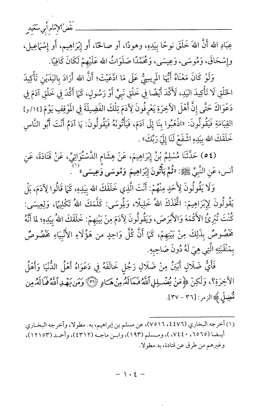 وَلَوْ كَانَ مَعْنَاهُ أَيُّهَا المَرِيسِيُّ عَلَى مَا ادَّعَيْتَ؛ أَنَّ الله أَرَادَ بِاليَدَيْنِ تَأْكِيدَ الخَلْقِ لَا تَأْكِيدَ اليَدِ، لَأَكَّدَ أَيْضًا فِي خَلْقِ نَبِيٍّ أَوْ رَسُولٍ، كَمَا أَكَّدَ فِي خَلْقِ آدَمَ فِي دَعْوَاكَ حَتَّى إِنَّ أَهْلَ الآخِرَةِ يَعْرِفُونَ لِآدَمَ تِلْكَ الفَضِيلَةَ فِي المَوْقِفِ يَوْمَ [14/و] القِيَامَةِ فَيَقُولُونَ: «اذْهَبُوا بِنَا إِلَى آدَمَ، فَيَأْتُونَهُ فَيَقُولُونَ: يَا آدَمُ أَنْتَ أَبُو النَّاسِ خَلَقَكَ الله بِيَدِهِ اشْفَعْ لَنَا إِلَيّ رَبِّكَ».
