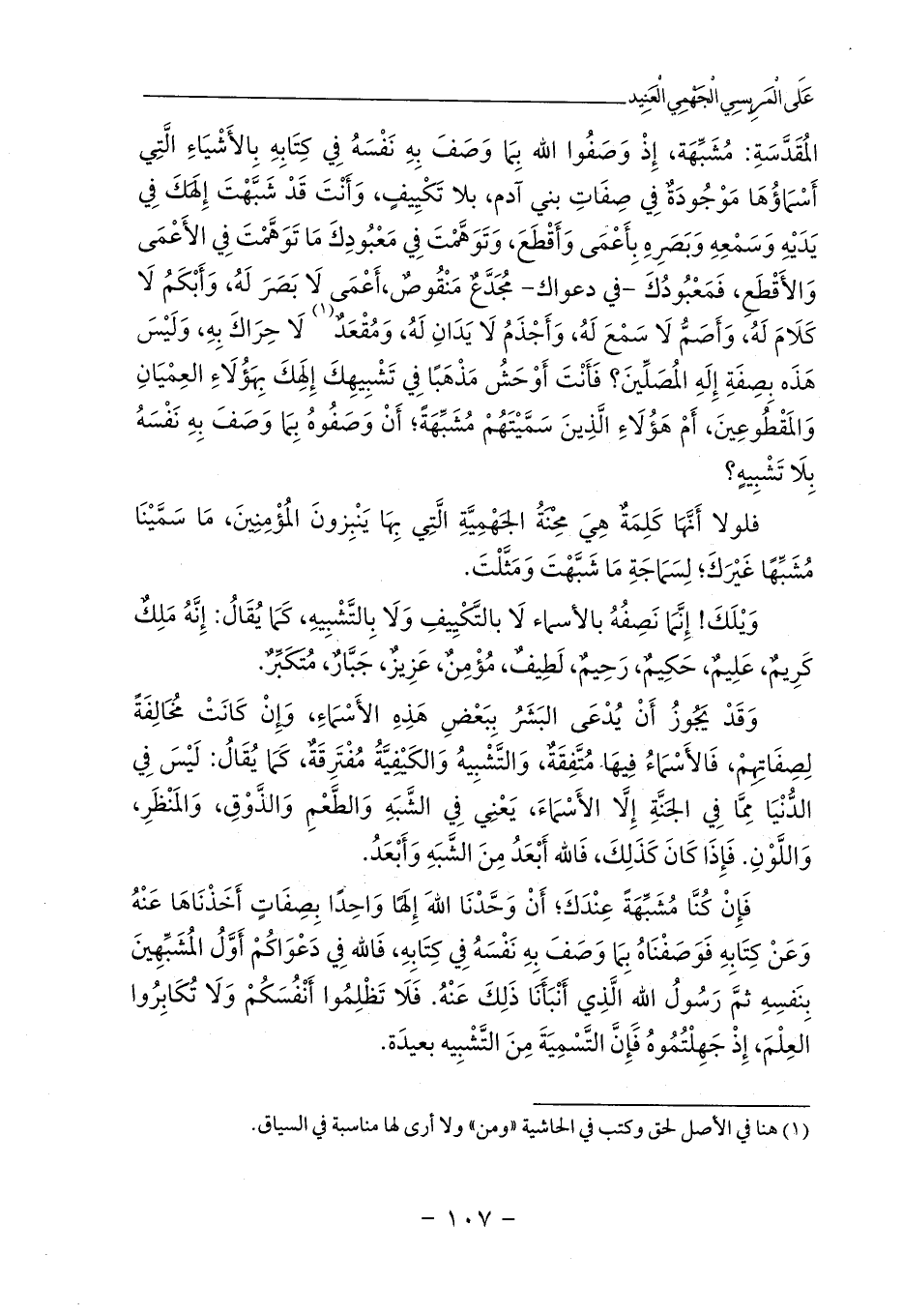 فلولا أَنَّهَا كَلِمَةٌ هِيَ مِحْنَةُ الجَهْمِيَّةِ الَّتِي بِهَا يَنْبِزونَ المُؤْمِنِينَ، مَا سَمَّيْنَا مُشَبِّهًا غَيْرَكَ؛ لِسَمَاجَةِ مَا شَبَّهْتَ وَمَثَّلْتَ.