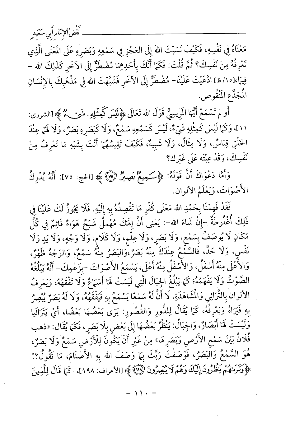 فَقَدْ فَهِمْنَا بِحَمْدِ الله مَعْنَى كُفْرِ مَا تَقْصِدُهُ بِهِ إِلَيْهِ. فَلَا يَجُوزُ لَكَ عَلَيْنَا فِي ذَلِكَ أُغْلُوطَةٌ -إِنْ شَاءَ الله-: يَعْنِي أَنَّ إِلَهَكَ مُهْملٌ شَبَحٌ هَوَاءٌ قَائِمٌ فِي كُلِّ مَكَانٍ لَا يُوصَفُ بِسَمْعٍ، وَلَا بَصَرٍ، وَلَا عِلْمٍ, وَلَا كَلَامٍ، وَلَا وَجْهٍ، وَلَا يَدٍ وَلَا نَفْسٍ، وَلَا حَدٍّ، فَالسَّمْعُ عِنْدَكَ مِنْهُ بَصَرٌ، وَالبَصَرُ مِنْهُ سَمْعٌ، وَالوَجْهُ ظَهْرٌ، وَالأَعْلَى مِنْهُ أَسْفَلُ، وَالأَسْفَلُ مِنْهُ أَعْلَى، يَسْمَعُ الأَصْوَاتَ -بِزَعْمِكَ- أَنَّهُ يَبْلُغُهُ الصَّوْتُ وَلَا يَفْهَمُهُ؛ كَمَا يَبْلُغُ الجِبَالَ الَّتِي لَيْسَتْ لَهَا أَسْمَاعٌ وَلَا تَفْقَهُهُ، وَيَعْرِفُ الألوان بِالتَّرَائِي وَالمُشَاهَدَةِ، لَا أَنَّ لَهُ سَمْعًا يَسْمَعُ بِهِ فَيَفْقَهُهُ، وَلَا لَهُ بَصَرٌ يُبْصِرُ بِهِ فَيَرَاهُ وَيَعْرِفُهُ، كَمَا يُقَالُ لِلدُّورِ وَالقُصُورِ: يَرَى بَعْضُهَا بَعْضًا، أَيْ يَتَرَائَيا وَلَيْسَتْ لَهَا أَبْصَارٌ، وَالجِبَالُ: يَنْظُرُ بَعْضُهَا إِلَى بَعْضٍ بِلَا بَصَرٍ، فَكَمَا يُقَال: «ذهب فُلَانٌ بَيْنَ سَمْعِ الأَرْضِ وَبَصَرِهَا» مِنْ غَيْرِ أَنْ يَكُونَ لِلْأَرْضِ سَمْعٌ وَلَا بَصَرٌ، هُوَ السَّمْعُ وَالبَصَرُ، فَوَصَفْتَ رَبَّكَ بِمَا وَصَفَ الله بِهِ الأَصْنَامَ، مَا تَقُولُ؟! {وَتَرَاهُمْ يَنْظُرُونَ إِلَيْكَ وَهُمْ لَا يُبْصِرُونَ (198)} [الأعراف: 198]، كَمَا قَالَ لِلَّذِينَ