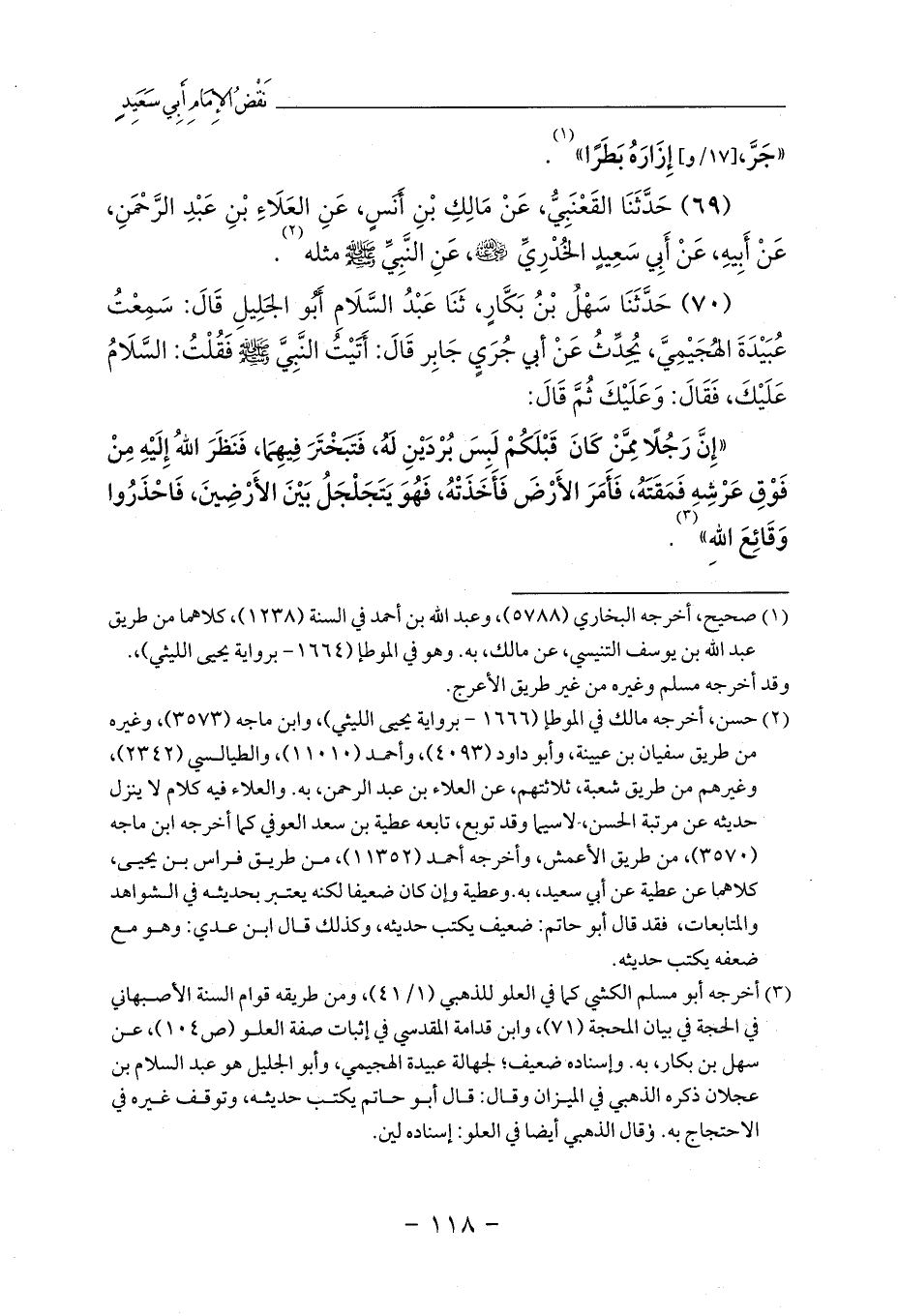 (¬2) حسن، أخرجه مالك في الموطإ (1666 - برواية يحيى الليثي)، وابن ماجه (3573)، وغيره من طريق سفيان بن عيينة، وأبو داود (4093)، وأحمد (11010)، والطيالسي (2342)، وغيرهم من طريق شعبة، ثلاثتهم، عن العلاء بن عبد الرحمن، به. والعلاء فيه كلام لا ينزل حديثه عن مرتبة الحسن، لاسيما وقد توبع، تابعه عطية بن سعد العوفي كما أخرجه ابن ماجه (3570)، من طريق الأعمش، وأخرجه أحمد (11352)، من طريق فراس بن يحيى، كلاهما عن عطية عن أبي سعيد، به. وعطية وإن كان ضعيفا لكنه يعتبر بحديثه في الشواهد والمتابعات، فقد قال أبو حاتم: ضعيف يكتب حديثه، وكذلك قال ابن عدي: وهو مع ضعفه يكتب حديثه.