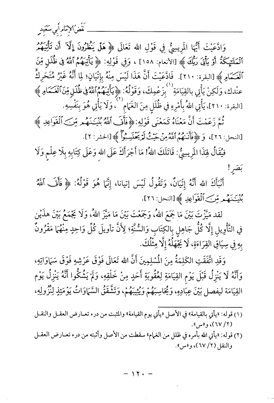 وَادَّعَيْتَ أَيُّهَا المَرِيسِيُّ فِي قَوْلِ الله تَعَالَى {هَلْ يَنْظُرُونَ إِلَّا أَنْ تَأْتِيَهُمُ الْمَلَائِكَةُ أَوْ يَأْتِيَ رَبُّكَ} [الأنعام: 158]، وَفِي قَوْلِهِ: {يَأْتِيَهُمُ اللَّهُ فِي ظُلَلٍ مِنَ الْغَمَامِ} [البقرة: 210]. فَادَّعَيْتَ أَنَّ هَذَا لَيْسَ مِنْهُ بِإِتْيَانٍ؛ لِما أَنَّهُ غَيْرُ مُتَحَرِكٍّ عنْدك، وَلَكِنْ يَأْتِي بالقِيَامَةِ (¬1) بِزَعْمِكَ، وَقَوْلُهُ: {يَأْتِيَهُمُ اللَّهُ فِي ظُلَلٍ مِنَ الْغَمَامِ} [البقرة: 210]، يَأْتِي اللهُ بِأَمْرِهِ في ظُلَلٍ مِنَ الغَمَامِ (¬2)، وَلَا يَأْتِي هُوَ بِنَفْسِهِ.