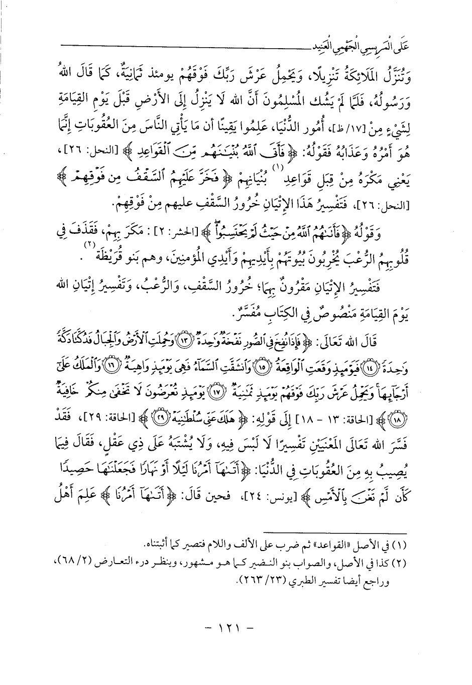 فَتَفْسِيرُ الإِتْيَانِ مَقْرُونٌ بِهِمَا؛ خُرُورُ السَّقْفِ، وَالرُّعْبُ، وَتَفْسِيرُ إِتْيَانِ الله يَوْمَ القِيَامَةِ مَنْصُوصٌ فِي الكِتَابِ مُفَسَّرٌ.