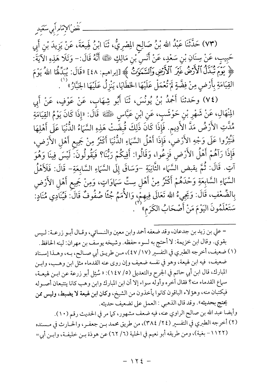 (73) حَدَّثَنَا عَبْدُ الله بْنُ صَالِحٍ المِصْرِيُّ، ثَنَا ابْنُ لَهِيعَةَ، عَنْ يَزِيدَ بْنِ أَبِي حَبِيبٍ، عَنْ سِنَانِ بْنِ سَعْدٍ، عَنْ أَنَسِ بْنِ مَالِكٍ - رضي الله عنه - أَنَّهُ قَالَ:- وَتَلَا هَذِهِ الآيَةَ: {يَوْمَ تُبَدَّلُ الْأَرْضُ غَيْرَ الْأَرْضِ وَالسَّمَاوَاتُ} [إبراهيم: 48] «قَالَ: يُبَدِّلُهَا اللهُ يَوْمَ القِيَامَةِ بِأَرْضٍ مِنْ فِضَّةٍ لَمْ تُعْمَلْ عَلَيْهَا الخَطَايَا، يَنْزِلُ عَلَيْهَا الجَبَّارُ» (¬1).
