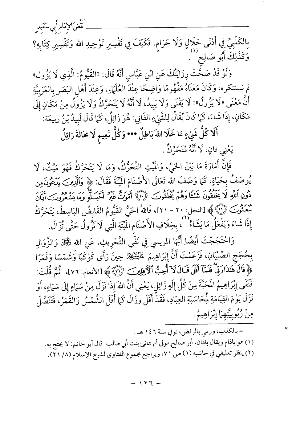وَلَوْ قَدْ صَحَّتْ رِوَايَتُكَ عَنِ ابْنِ عَبَّاسٍ أَنَّهُ قَالَ: «القَيُّومُ: الَّذِي لَا يَزُول» لم نستنكره، وَكَانَ مَعْنَاهُ مَفْهُومًا وَاضِحًا عِنْدَ العُلَمَاءِ، وَعِنْدَ أَهْلِ البَصَر بِالعَرَبِيَّةِ أَنَّ مَعْنَى «لَا يَزُولُ»: لَا يَفْنَى وَلَا يَبِيدُ، لَا أَنَّهُ لَا يَتَحَرَّكُ وَلَا يَزُولُ مِنْ مَكَانٍ إِلَى مَكَانٍ، إِذَا شَاءَ، كَمَا كَانَ يُقَالُ لِلشَّيْءِ الفَانِي: هُوَ زَائِلٌ، كَمَا قَالَ لَبِيدُ بْنُ ربيعَة: