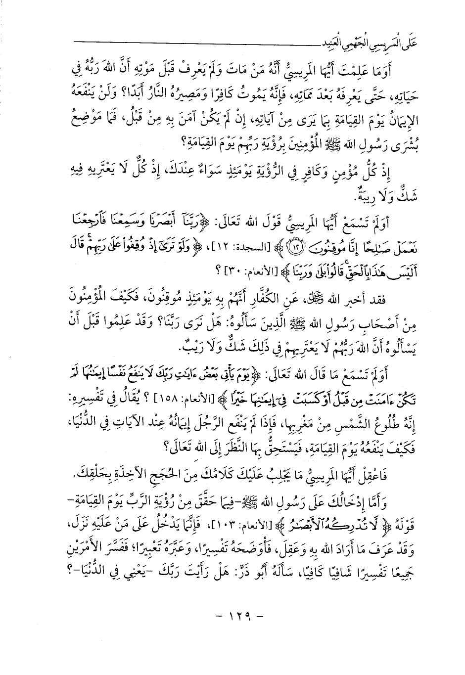 أَوَمَا عَلِمْتَ أَيُّهَا المَرِيسِيُّ أَنَّهُ مَنْ مَاتَ وَلَمْ يَعْرِفْ قَبْلَ مَوْتِهِ أَنَّ اللهَ رَبُّهُ فِي حَيَاتِهِ، حَتَّى يَعْرِفَهُ بَعْدَ مَمَاتِهِ، فَإِنَّهُ يَمُوتُ كَافِرًا وَمَصِيرُهُ النَّارُ أَبَدًا؟ وَلَنْ يَنْفَعَهُ الإِيمَانُ يَوْمَ القِيَامَةِ بِمَا يَرَى مِنْ آيَاتِهِ، إِنْ لَمْ يَكُنْ آمَنَ بِهِ مِنْ قَبْلُ، فَمَا مَوْضِعُ بُشْرَى رَسُولِ الله - صلى الله عليه وسلم - المُؤْمِنِينَ بِرُؤْيَةِ رَبِّهِمْ يَوْمَ القِيَامَةِ؟