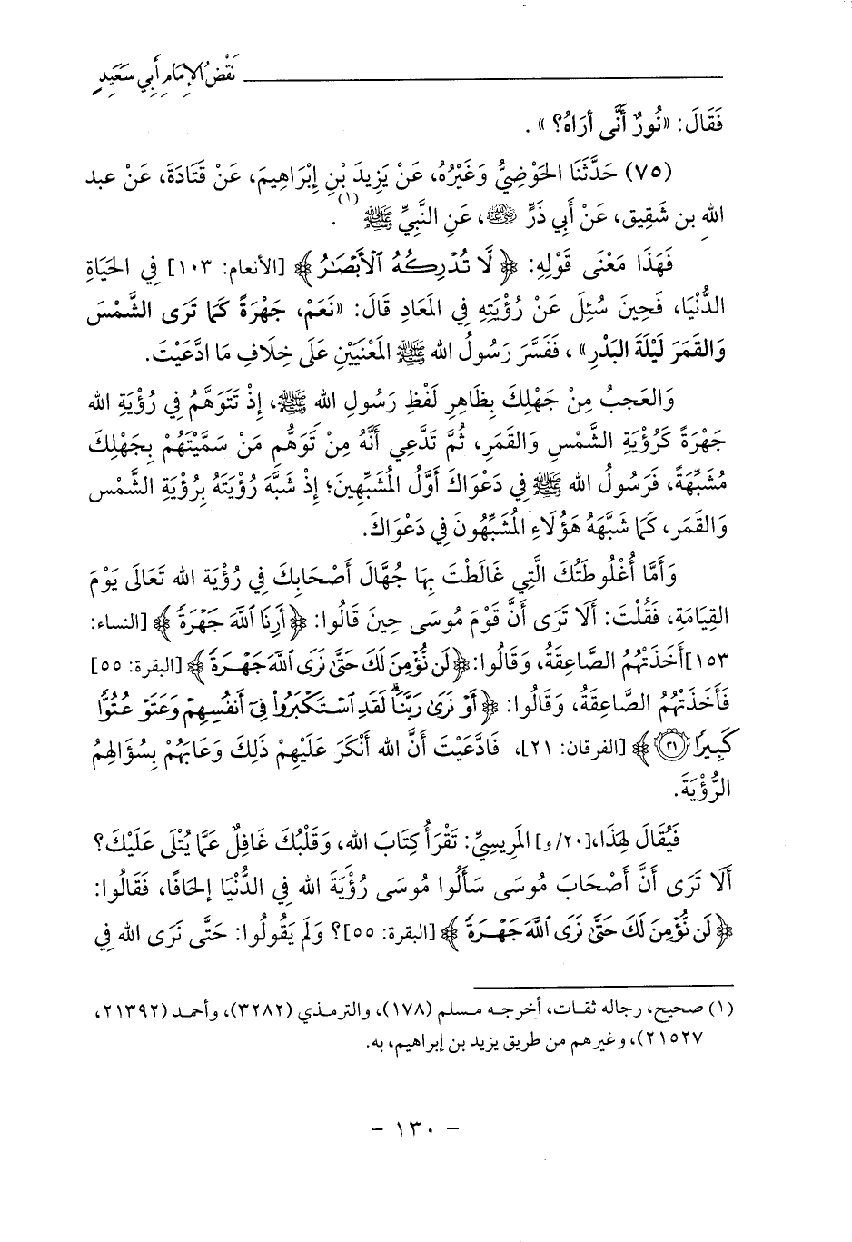 وَالعَجبُ مِنْ جَهْلِكَ بِظَاهِرِ لَفْظِ رَسُولِ اللهِ - صلى الله عليه وسلم -، إِذْ تَتَوَهَّمُ فِي رُؤْيَةِ الله جَهْرَةً كَرُؤْيَةِ الشَّمْسِ وَالقَمَرِ، ثُمَّ تَدَّعِي أَنَّهُ مِنْ تَوَهُّمِ مَنْ سَمَّيْتَهُمْ بِجَهْلِكَ مُشَبِّهَةً، فَرَسُولُ الله - صلى الله عليه وسلم - فِي دَعْوَاكَ أَوَّلُ المُشَبِّهِينَ؛ إِذْ شَبَّهَ رُؤْيَتَهُ بِرُؤْيَةِ الشَّمْس وَالقَمَر، كَمَا شَبَّهَهُ هَؤُلَاءِ المُشَبِّهُونَ فِي دَعْوَاكَ.