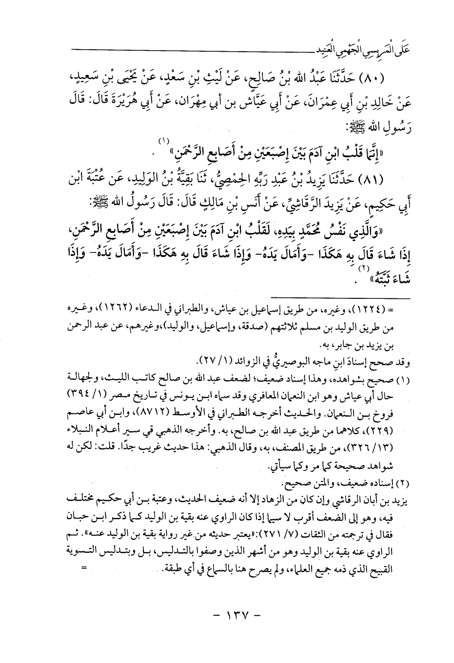 يزيد بن أبان الرقاشي وإن كان من الزهاد إلا أنه ضعيف الحديث، وعتبة بن أبي حكيم مختلف فيه، وهو إلى الضعف أقرب لا سيما إذا كان الراوي عنه بقية بن الوليد كما ذكر ابن حبان فقال في ترجمته من الثقات (7/ 271): «يعتبر حديثه من غير رواية بقية بن الوليد عنه». ثم الراوي عنه بقية بن الوليد وهو من أشهر الذين وصفوا بالتدليس، بل وبتدليس التسوية القبيح الذي ذمه جميع العلماء، ولم يصرح هنا بالسماع في أي طبقة. ... =