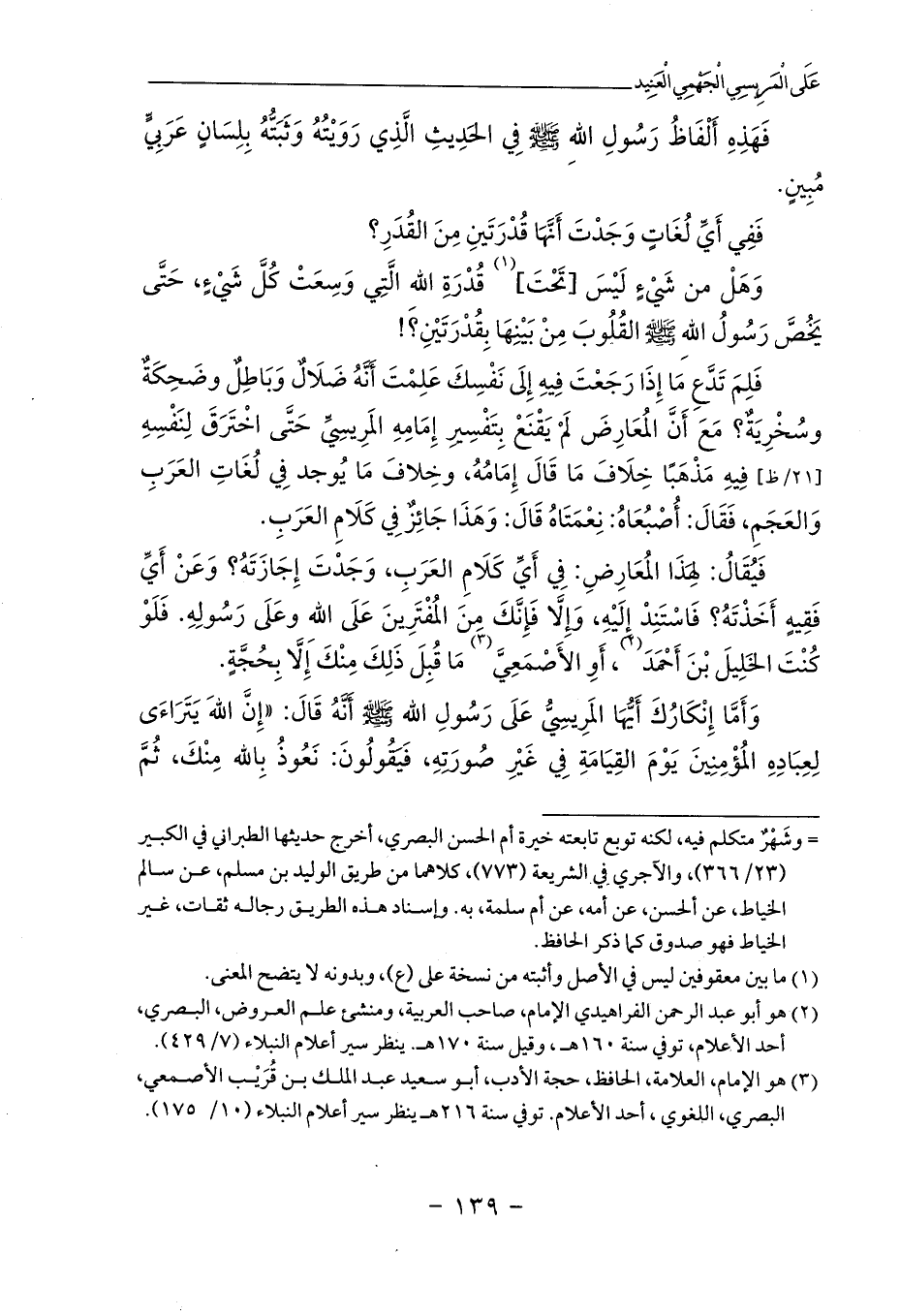 فَلِمَ تَدَّعِ مَا إِذَا رَجَعْتَ فِيهِ إِلَى نَفْسِكَ عَلِمْتَ أَنَّهُ ضَلَالٌ وَبَاطِلٌ وضَحِكَةٌ وسُخْرِيَةٌ؟ مَعَ أَنَّ المُعَارِضَ لَمْ يَقْنَعْ بِتَفْسِيرِ إِمَامِهِ المَرِيسِيِّ حَتَّى اخْتَرَقَ لِنَفْسِهِ [21/ظ] فِيهِ مَذْهَبًا خِلَافَ مَا قَالَ إِمَامُهُ، وخِلافَ مَا يُوجد فِي لُغَاتِ العَرَبِ وَالعَجَمِ، فَقَالَ: أُصْبُعَاهُ: نِعْمَتَاهُ قَالَ: وَهَذَا جَائِزٌ فِي كَلَامِ العَرَبِ.