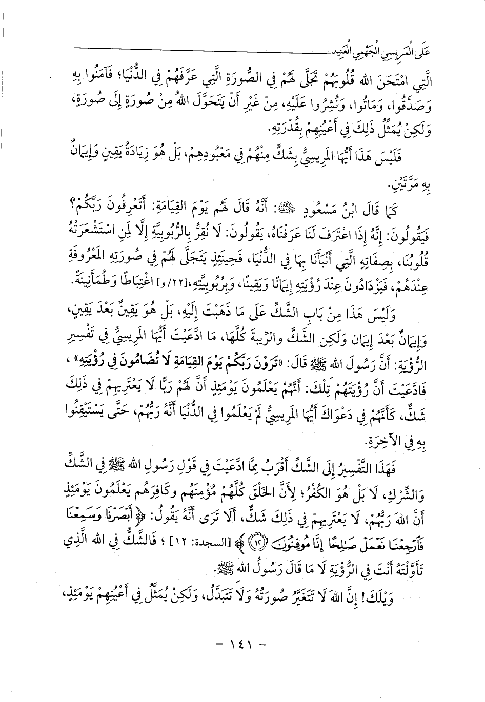 وَلَيْسَ هَذَا مِنْ بَابِ الشَّكِّ عَلَى مَا ذَهَبْتَ إِلَيْهِ، بَلْ هُوَ يَقِينٌ بَعْدَ يَقِينٍ، وَإِيمَانٌ بَعْدَ إِيمَان وَلَكِن الشَّكَّ والرِّيبةَ كُلَّهَا، مَا ادَّعَيْتَ أَيُّهَا المَرِيسِيُّ فِي تَفْسِيرِ الرُّؤْيَةِ: أَنَّ رَسُولَ اللهِ - صلى الله عليه وسلم - قَالَ: «تَرَوْنَ رَبَّكُمْ يَوْمَ القِيَامَةِ لَا تُضَامُونَ فِي رُؤْيَتِهِ»، فَادَّعَيْتَ أَنَّ رُؤْيَتَهُمْ تِلْكَ: أَنَّهُمْ يَعْلَمُونَ يَوْمَئِذٍ أَنَّ لَهُمْ رَبًّا لَا يَعْتَرِيهِمْ فِي ذَلِكَ شَكٌّ، كَأَنَّهُمْ فِي دَعْوَاكَ أَيُّهَا المَرِيسِيُّ لَمْ يَعْلَمُوا فِي الدُّنْيَا أَنَّهُ رَبُّهُمْ، حَتَّى يَسْتَيْقِنُوا بِهِ فِي الآخِرَةِ.