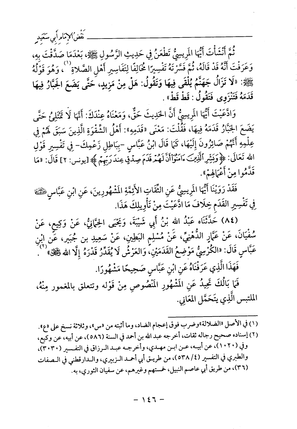فَقَدْ رَوَيْنَا أَيُّهَا المَرِيسِيُّ عَنِ الثِّقَاتِ الأَئِمَّةِ المَشْهُورِينَ، عَنِ ابْنِ عَبَّاسٍ - رضي الله عنهما - فِي تَفْسِيرِ القَدَمِ خِلَافَ مَا ادَّعَيْتَ مِنْ تَأْوِيلِكَ هَذَا.