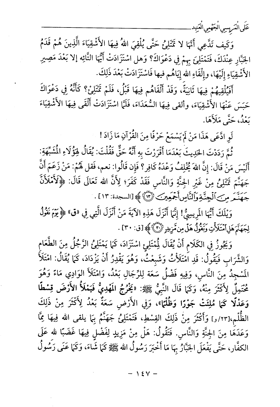 وَكَيف تَدَّعِي أَنَّهَا لا تَمْتَلِئُ حَتَّى يُلْقِيَ اللهُ فِيهَا الأَشْقِيَاءَ الَّذِينَ هُمْ قَدَمُ الجَبَّارِ عِنْدَكَ، فَتَمْتَلِئَ بِهِمْ فِي دَعْوَاكَ؟ وَهل اسْتَزَادَتْ أَيُّهَا التَّائِه إلا بَعْدَ مَصِيرِ الأَشْقِيَاءِ إِلَيْهَا، وإِلْقَاءِ اللهِ إِيَاهُم فيها فَاسْتَزَادَتْ بَعْدَ ذَلِكَ.