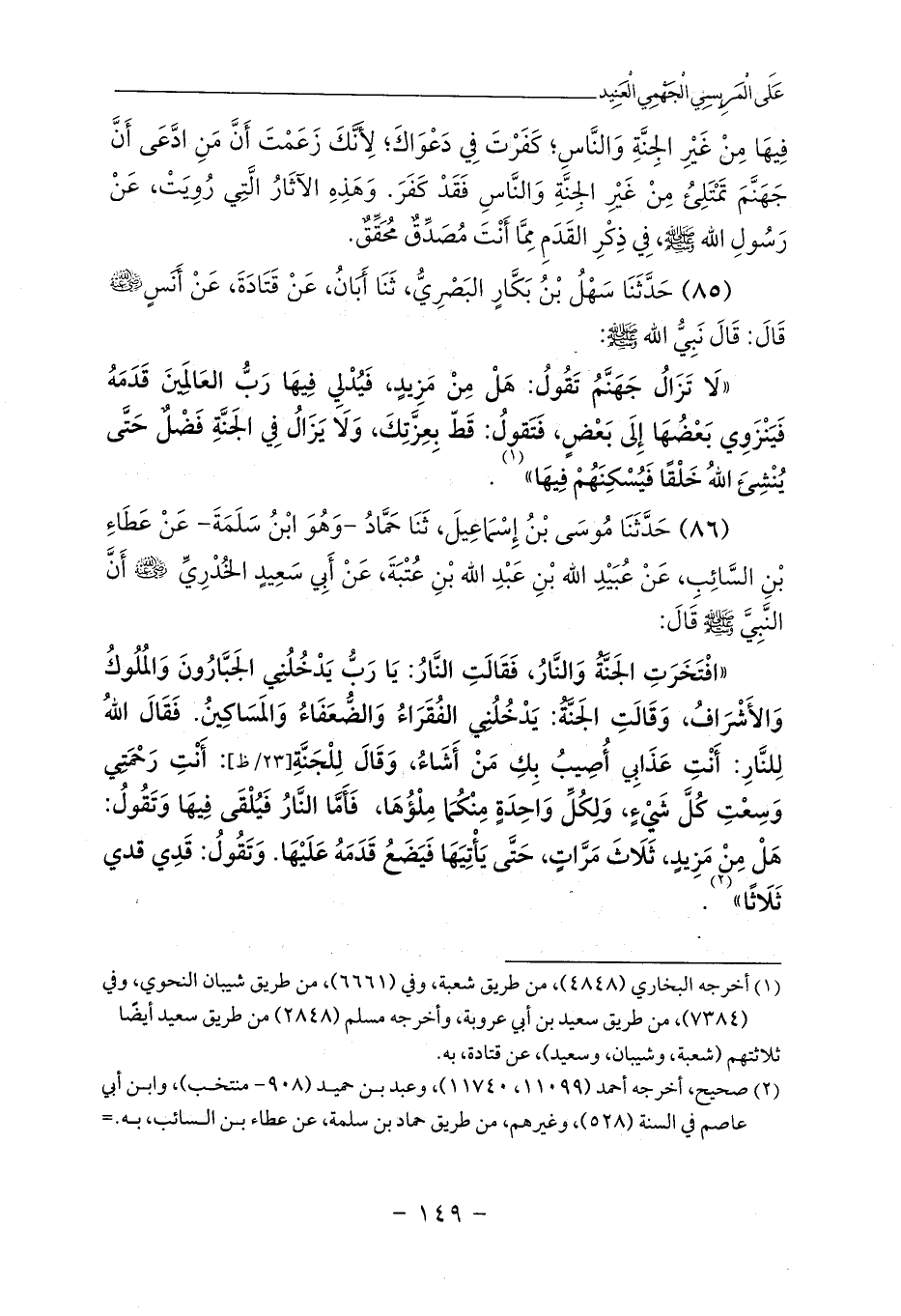 فِيهَا مِنْ غَيْرِ الجِنَّةِ وَالنَّاسِ؛ كَفَرْتَ فِي دَعْوَاكَ؛ لِأَنَّكَ زَعَمْتَ أَنَّ مَنِ ادَّعَى أَنَّ جَهَنَّمَ تَمْتَلِئُ مِنْ غَيْرِ الجِنَّةِ وَالنَّاسِ فَقَدْ كَفَرَ. وَهَذِهِ الآثَارُ الَّتِي رُوِيَتْ، عَنْ رَسُولِ الله - صلى الله عليه وسلم -، فِي ذِكْرِ القَدَمِ مِمَّا أَنْتَ مُصَدِّقٌ مُحَقِّقٌ.