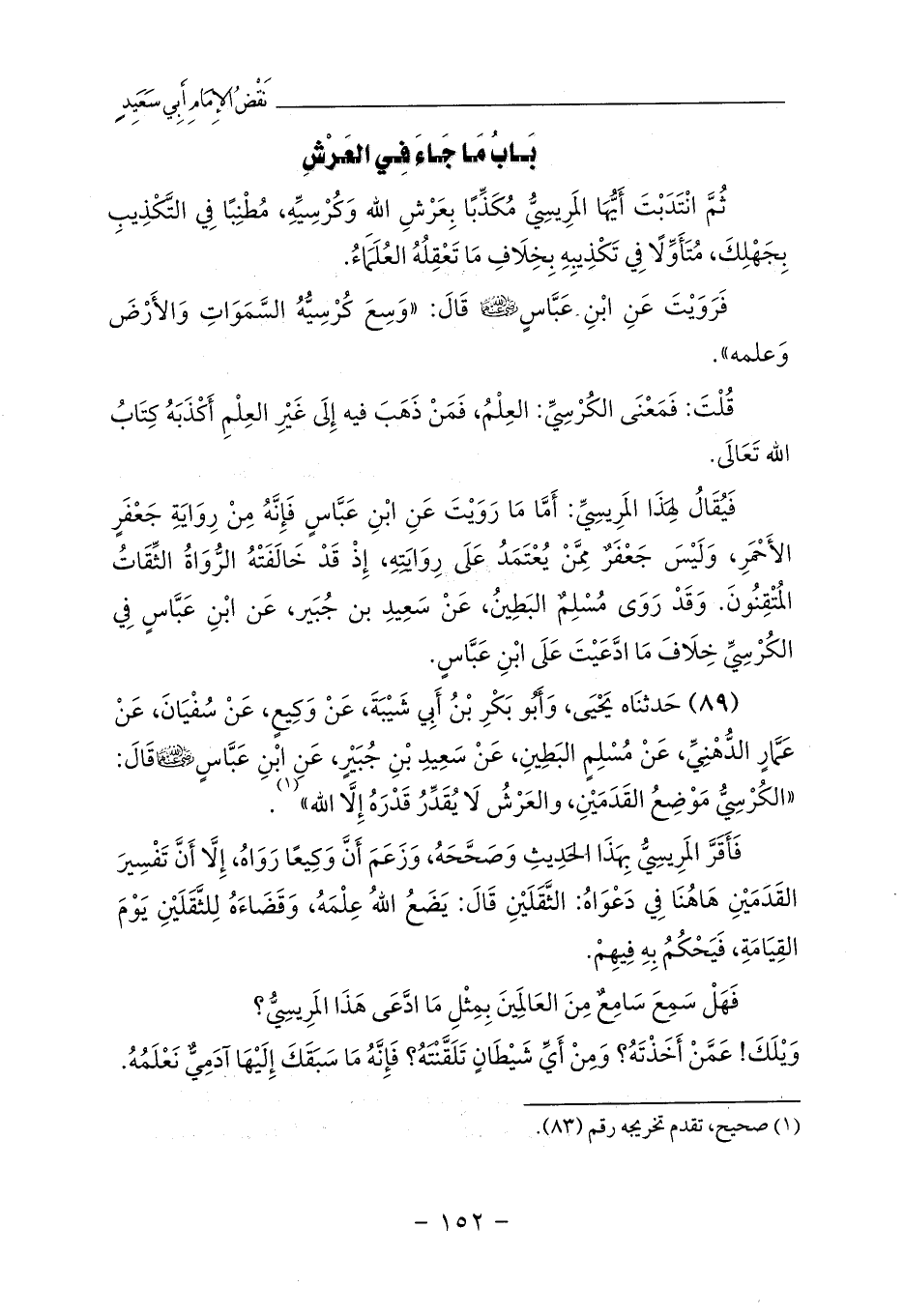 (89) حَدثنَاه يَحْيَى، وَأَبُو بَكْرِ بْنُ أَبِي شَيْبَةَ، عَنْ وَكِيعٍ، عَنْ سُفْيَانَ، عَنْ عَمَّارٍ الدُّهْنِيِّ، عَنْ مُسْلِمٍ البَطِينِ، عَنْ سَعِيدِ بْنِ جُبَيْرٍ، عَنِ ابْنِ عَبَّاسٍ - رضي الله عنهما - قَالَ: «الكُرْسِيُّ مَوْضِعُ القَدَمَيْنِ، والعَرْشُ لَا يُقَدِّرُ قَدْرَهُ إِلَّا الله» (¬1).