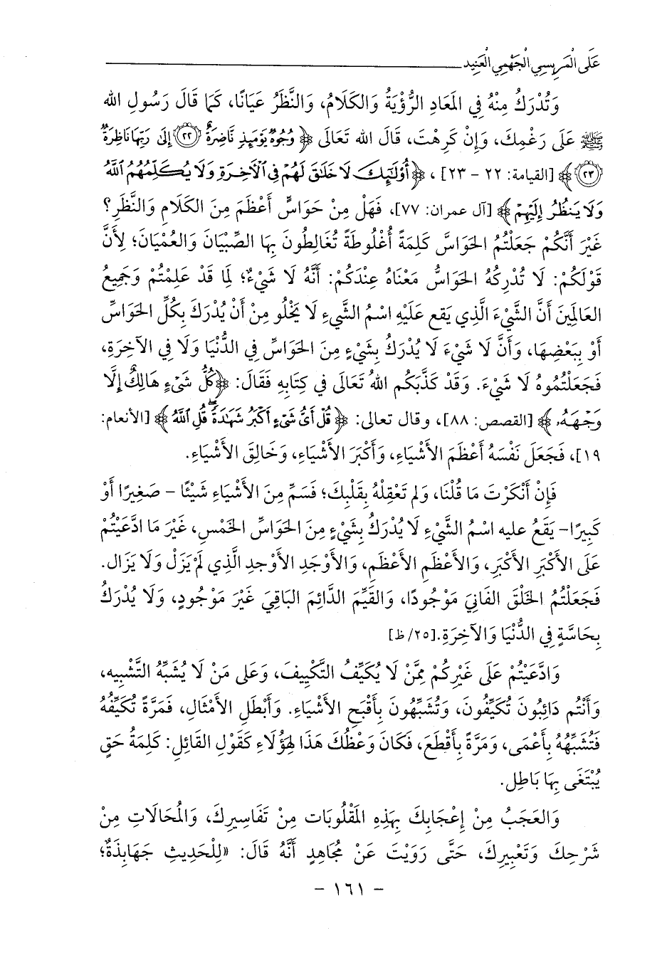 وَتُدْرَكُ مِنْهُ فِي المَعَادِ الرُّؤْيَةُ وَالكَلَامُ، وَالنَّظَرُ عَيَانًا، كَمَا قَالَ رَسُولِ الله - صلى الله عليه وسلم - عَلَى رَغْمِكَ، وَإِنْ كَرِهْتَ، قَالَ الله تَعَالَى {وُجُوهٌ يَوْمَئِذٍ نَاضِرَةٌ (22) إِلَى رَبِّهَا نَاظِرَةٌ (23)} [القيامة: 22 - 23]، {أُولَئِكَ لَا خَلَاقَ لَهُمْ فِي الْآخِرَةِ وَلَا يُكَلِّمُهُمُ اللَّهُ وَلَا يَنْظُرُ إِلَيْهِمْ} [آل عمران: 77]، فَهَلْ مِنْ حَوَاسٍّ أَعْظَمَ مِنَ الكَلَامِ وَالنَّظَرِ؟ غَيْرَ أَنَّكُمْ جَعَلْتُمُ الحَوَاسَّ كَلِمَةً أُغْلُوطَةً تُغَالِطُونَ بِهَا الصِّبْيَانَ وَالعُمْيَانَ؛ لِأَنَّ قَوْلَكُمْ: لَا تُدْرِكُهُ الحَوَاسُّ مَعْنَاهُ عِنْدَكُمْ: أَنَّهُ لَا شَيْءٌ؛ لِمَا قَدْ عَلِمْتُمْ وَجَمِيعُ العَالَمِينَ أَنَّ الشَّيْءَ الَّذِي يَقع عَلَيْهِ اسْمُ الشَّيءِ لَا يَخْلُو مِنْ أَنْ يُدْرَكَ بِكُلِّ الحَوَاسِّ أَوْ بِبَعْضِهَا، وَأَنَّ لَا شَيْءَ لَا يُدْرَكُ بِشَيْءٍ مِنَ الحَوَاسِّ فِي الدُّنْيَا وَلَا فِي الآخِرَةِ، فَجَعَلْتُمُوهُ لَا شَيْءَ. وَقَدْ كَذَّبَكُم اللهُ تَعَالَى في كِتَابِهِ فَقَالَ: {كُلُّ شَيْءٍ هَالِكٌ إِلَّا وَجْهَهُ} [القصص: 88]، وقال تعالى: {قُلْ أَيُّ شَيْءٍ أَكْبَرُ شَهَادَةً قُلِ اللَّهُ} [الأنعام: 19]، فَجَعَلَ نَفْسَهُ أَعْظَمَ الأَشْيَاءِ، وَأَكْبَرَ الأَشْيَاءِ، وَخَالِقَ الأَشْيَاءِ.