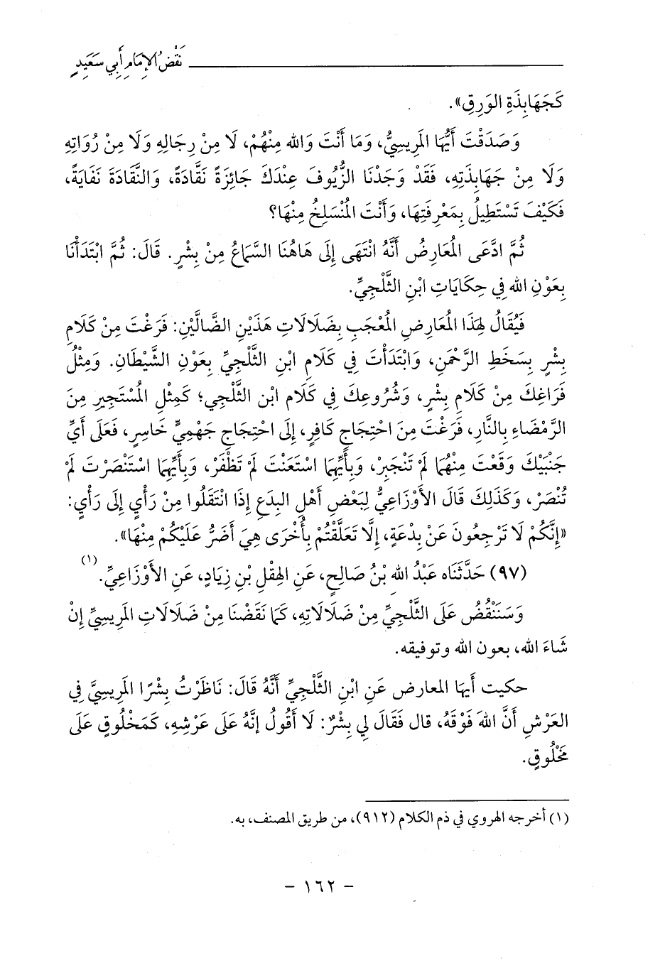 حكيت أَيهَا المعارض عَنِ ابْنِ الثَّلْجِيِّ أَنَّهُ قَالَ: نَاظَرْتُ بِشْرًا المَرِيسِيَّ فِي العَرْشِ أَنَّ اللهَ فَوْقَهُ، قال فَقَالَ لِي بِشْرٌ: لَا أَقُولُ إنَّهُ عَلَى عَرْشِهِ، كَمَخْلُوقٍ عَلَى مَخْلُوقٍ.