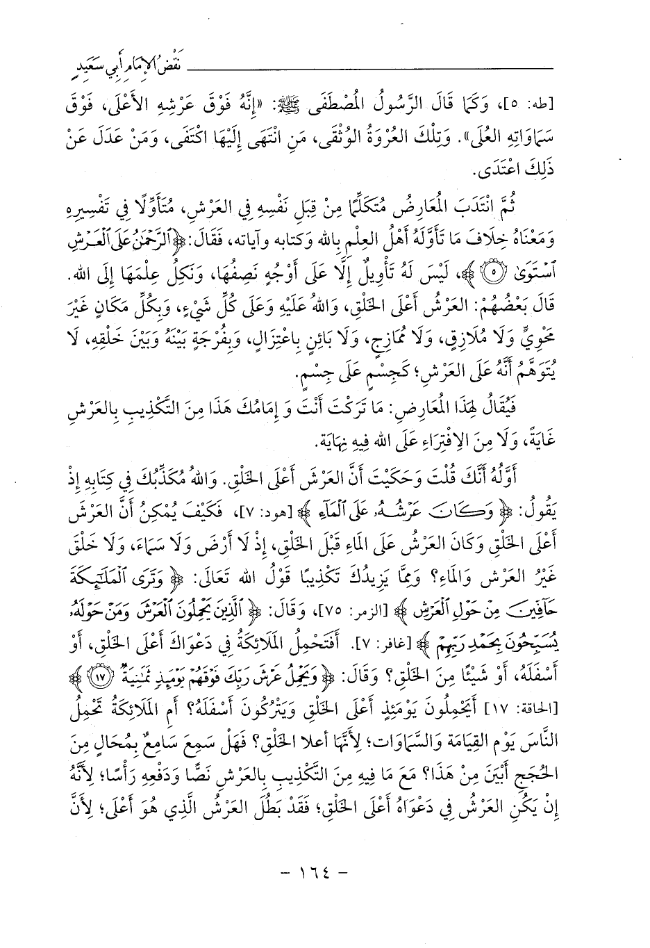 ثُمَّ انْتَدَبَ المُعَارِضُ مُتَكَلِّمًا مِنْ قِبَلِ نَفْسِهِ فِي العَرْشِ، مُتَأَوِّلًا فِي تَفْسِيرِهِ وَمَعْنَاهُ خِلَافَ مَا تَأَوَّلَهُ أَهْلُ العِلْمِ بِالله وَكتابه وآياته، فَقَالَ: {الرَّحْمَنُ عَلَى الْعَرْشِ اسْتَوَى (5)}، لَيْسَ لَهُ تَأْوِيلٌ إِلَّا عَلَى أَوْجُهٍ نَصِفُهَا، وَنَكِلُ عِلْمَهَا إِلَى الله.