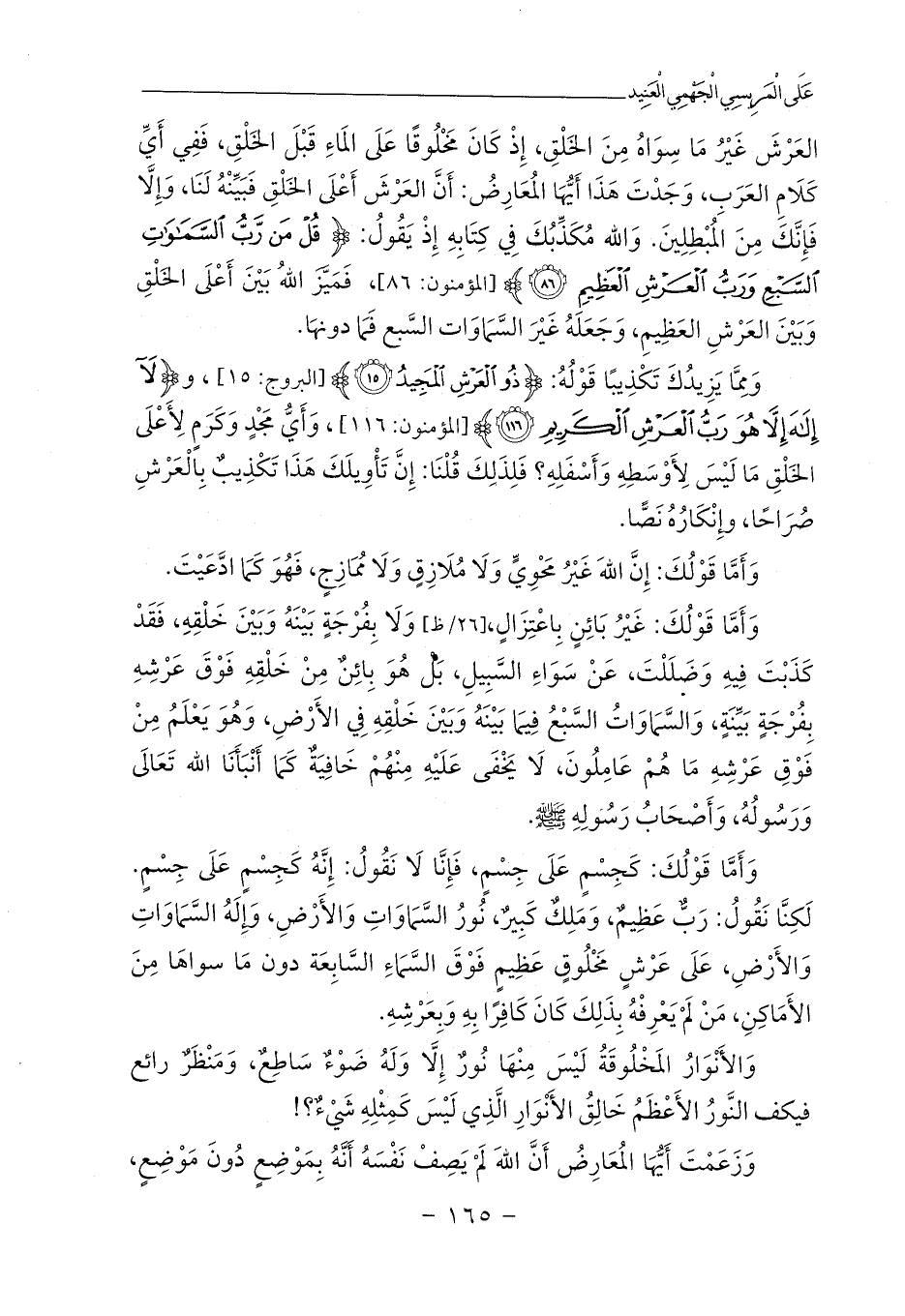 وَمِمَّا يَزِيدُكَ تَكْذِيبًا قَوْلُهُ: {ذُو الْعَرْشِ الْمَجِيدُ (15)} [البروج: 15]، و {لَا إِلَهَ إِلَّا هُوَ رَبُّ الْعَرْشِ الْكَرِيمِ (116)} [المؤمنون: 116]، وَأَيُّ مَجْدٍ وَكَرَمٍ لِأَعْلَى الخَلْقِ مَا لَيْسَ لِأَوْسَطِهِ وَأَسْفَلِهِ؟ فَلِذَلِكَ قُلْنَا: إِنَّ تَأْوِيلَكَ هَذَا تَكْذِيبٌ بِالْعَرْشِ صُرَاحًا، وإِنْكَارُهُ نَصًّا.