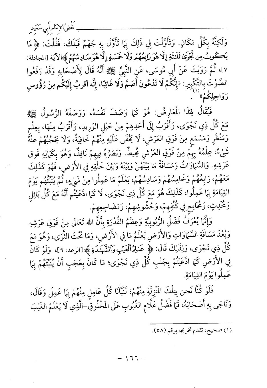 مَعَ كُلِّ ذِي نَجْوَى، وَأَقْرَبُ إِلَى أَحَدِهِمْ مِنْ حَبْلِ الوَرِيدِ، وَأَقْرَبُ مِنْهَا، بِعِلْمٍ وَمَنْظَرٍ وَمَسْمَعٍ مِنْ فَوْقِ العَرْشِ، لَا يَخْفَى عَلَيْهِ مِنْهُمْ خَافِيَةٌ، وَلَا يَحْجُبُهُمْ عنْهُ شَيْءٌ، عِلْمُهُ بِهِمْ مِنْ فَوْقِ العَرْشِ مُحِيطٌ. وَبَصَرُهُ فِيهِمْ نَافِذٌ، وَهُوَ بِكَمَالِهِ فَوق عَرْشِهِ. وَالسَّمَاوَاتُ وَمَسَافَةُ مَا بَيْنَهُنَّ وَبَيْنَهُ وَبَيْنَ خَلْقِهِ فِي الأَرْضِ، فَهُوَ كَذَلِكَ مَعَهُمْ، رَابِعُهُمْ وَخَامِسُهُمْ وَسَادِسُهُمْ، يَعْلَمُ مَا عَمِلُوا مِنْ شَيْءٍ، ثُمَّ يُنَبِّئُهُم يَوْمَ القِيَامَةِ بِمَا عَمِلُوا، كَذَلِكَ هُوَ مَعَ كُلِّ ذِي نَجْوَى، لَا كَمَا ادَّعَيْتُم أَنَّهُ مَعَ كُلِّ بَائِلٍ وَمُحْدِثٍ، وَمُجَامِعٍ فِي كُنُفِهِمْ، وَحُشُوشِهِمْ، وَمَضَاجِعِهِمْ.