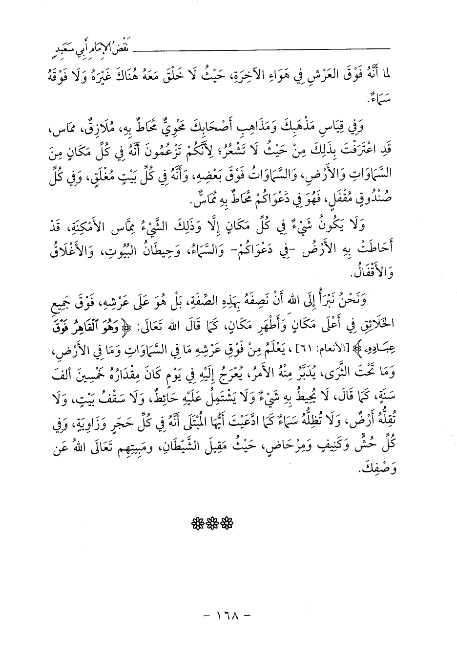 وَنَحْنُ نَبْرَأُ إِلَى اللهِ أَنْ نَصِفَهُ بِهَذِهِ الصِّفَةِ، بَلْ هُوَ عَلَى عَرْشِهِ، فَوْقَ جَمِيعِ الخَلَائِقِ فِي أَعْلَى مَكَانٍ وَأَطْهَرِ مَكَانٍ، كَمَا قَالَ الله تَعَالَى: {وَهُوَ الْقَاهِرُ فَوْقَ عِبَادِهِ} [الأنعام: 61]، يَعْلَمُ مِنْ فَوْقِ عَرْشِهِ مَا فِي السَّمَاوَاتِ وَمَا فِي الأَرْضِ، وَمَا تَحْتَ الثَّرَى، يُدَبَّرُ مِنْهُ الأَمرُ، يُعْرَجُ إِلَيْهِ فِي يَوْمٍ كَانَ مِقْدَارُهُ خَمْسِينَ ألفَ سَنَةٍ، كَمَا قَالَ، لَا يُحِيطُ بِهِ شَيْءٌ وَلَا يَشْتَمِلُ عَلَيْهِ حَائِطٌ، وَلَا سَقْفُ بَيْتٍ، وَلَا تُقِلُّهُ أَرْضٌ، وَلَا تُظِلُّهُ سَمَاءٌ كَمَا ادَّعَيْتَ أَيُّهَا المُبْتَلَى أَنَّهُ فِي كُلِّ حَجَرٍ وَزَاوِيَةٍ، وَفِي كُلِّ حُشٍّ وَكَنِيفٍ وَمِرْحَاضٍ، حَيْثُ مَقِيلَ الشَّيْطَانِ، ومَبِيتِهِم تَعَالَى اللهُ عَن وَصْفِكَ.