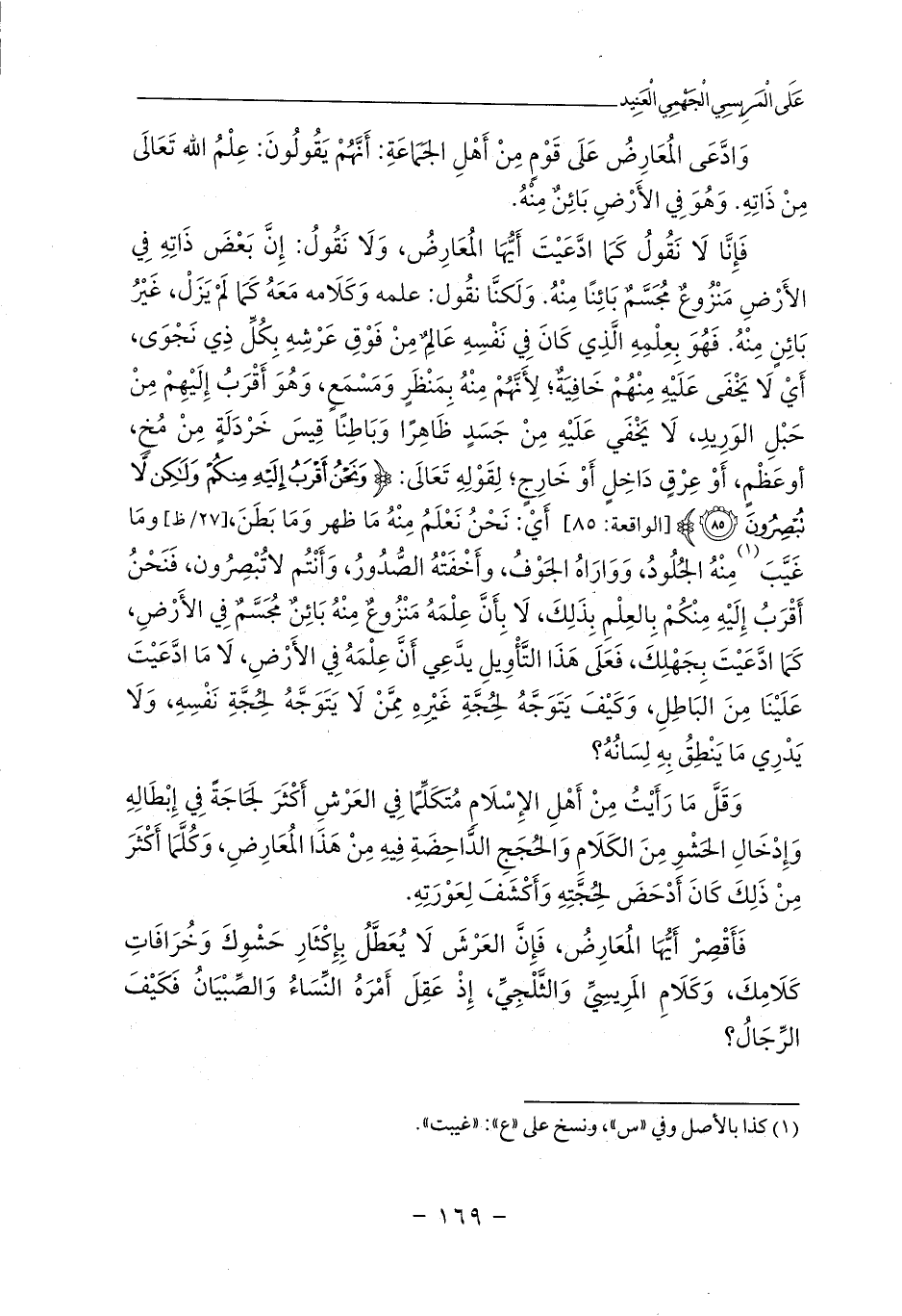 فَإِنَّا لَا نَقُولُ كَمَا ادَّعَيْتَ أَيُّهَا المُعَارِضُ، وَلَا نَقُولُ: إِنَّ بَعْضَ ذَاتِهِ فِي الأَرْضِ مَنْزُوعٌ مُجَسَّمٌ بَائِنًا مِنْهُ. وَلَكنَّا نقُول: علمه وَكَلَامه مَعَهُ كَمَا لَمْ يَزَلْ، غَيْرُ بَائِنٍ مِنْهُ. فَهُوَ بِعِلْمِهِ الَّذِي كَانَ فِي نَفْسِهِ عَالِمٌ مِنْ فَوْقِ عَرْشِهِ بِكُلِّ ذِي نَجْوَى، أَيْ لَا يَخْفَى عَلَيْهِ مِنْهُمْ خَافِيَةٌ؛ لِأَنَّهُمْ مِنْهُ بِمَنْظَرٍ وَمَسْمَعٍ، وَهُوَ أَقْرَبُ إِلَيْهِمْ مِنْ حَبْلِ الوَرِيدِ، لَا يَخْفَي عَلَيْهِ مِنْ جَسَدٍ ظَاهِرًا وَبَاطِنًا قِيسَ خَرْدَلَةٍ مِنْ مُخٍ، أوعَظْمٍ، أَوْ عِرْقٍ دَاخِلٍ أَوْ خَارِجٍ؛ لِقَوْلِهِ تَعَالَى: {وَنَحْنُ أَقْرَبُ إِلَيْهِ مِنْكُمْ وَلَكِنْ لَا تُبْصِرُونَ (85)} [الواقعة: 85] أَيْ: نَحْنُ نَعْلَمُ مِنْهُ مَا ظهر وَمَا بَطَنَ، [27/ظ] ومَا غَيَّبَ (¬1) مِنْهُ الجُلُودُ، وَوَارَاهُ الجَوْفُ، وأَخْفَتْهُ الصُّدُورُ، وَأَنْتُم لاتُبْصِرُون، فَنَحْنُ أَقْرَبُ إِلَيْهِ مِنْكُمْ بِالعِلْمِ بِذَلِكَ، لَا بِأَنَّ عِلْمَهُ مَنْزُوعٌ مِنْهُ بَائِنٌ مُجَسَّمٌ فِي الأَرْضِ، كَمَا ادَّعَيْتَ بِجَهْلِكَ, فَعَلَى هَذَا التَّأْوِيلِ يدَّعِي أَنَّ عِلْمَهُ فِي الأَرْضِ, لَا مَا ادَّعَيْتَ عَلَيْنَا مِنَ البَاطِلِ، وَكَيْفَ يَتَوَجَّهُ لِحُجَّةِ غَيْرِهِ مِمَّنْ لَا يَتَوَجَّهُ لِحُجَّةِ نَفْسِهِ، وَلَا يَدْرِي مَا يَنْطِقُ بِهِ لِسَانُهُ؟