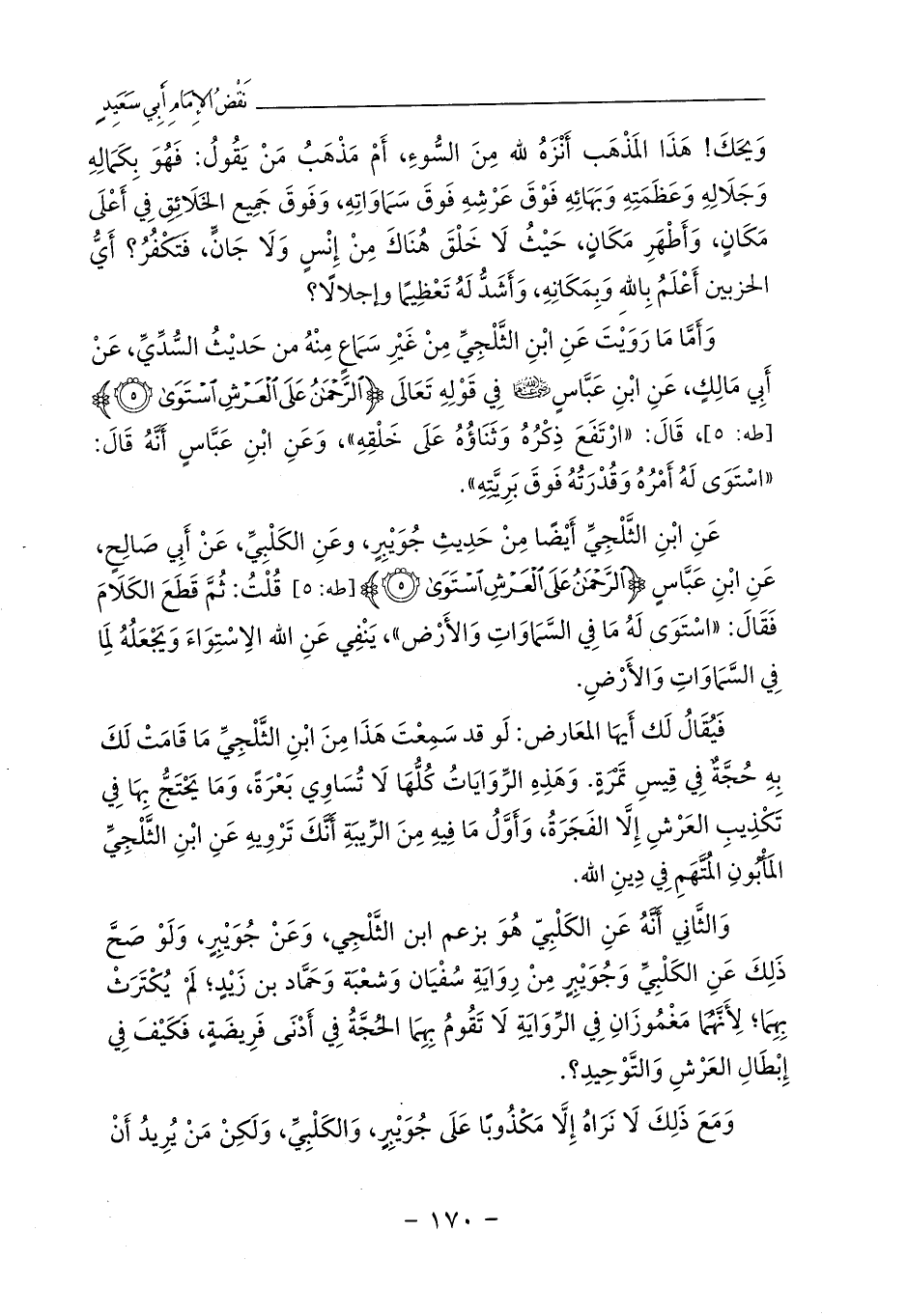 فَيُقَالُ لَك أَيهَا المعَارض: لَو قد سَمِعْتَ هَذَا مِنَ ابْنِ الثَّلْجِيِّ مَا قَامَتْ لَكَ بِهِ حُجَّةٌ فِي قِيسِ تَمْرَةٍ. وَهَذِهِ الرِّوَايَاتُ كُلُّهَا لَا تُسَاوِي بَعْرَةً، وَمَا يَحْتَجُّ بِهَا فِي تَكْذِيبِ العَرْشِ إِلَّا الفَجَرَةُ، وَأَوَّلُ مَا فِيهِ مِنَ الرِّيبَةِ أَنَّكَ تَرْوِيهِ عَنِ ابْنِ الثَّلْجِيِّ المَأْبُونِ المُتَّهَمِ فِي دِينِ الله.