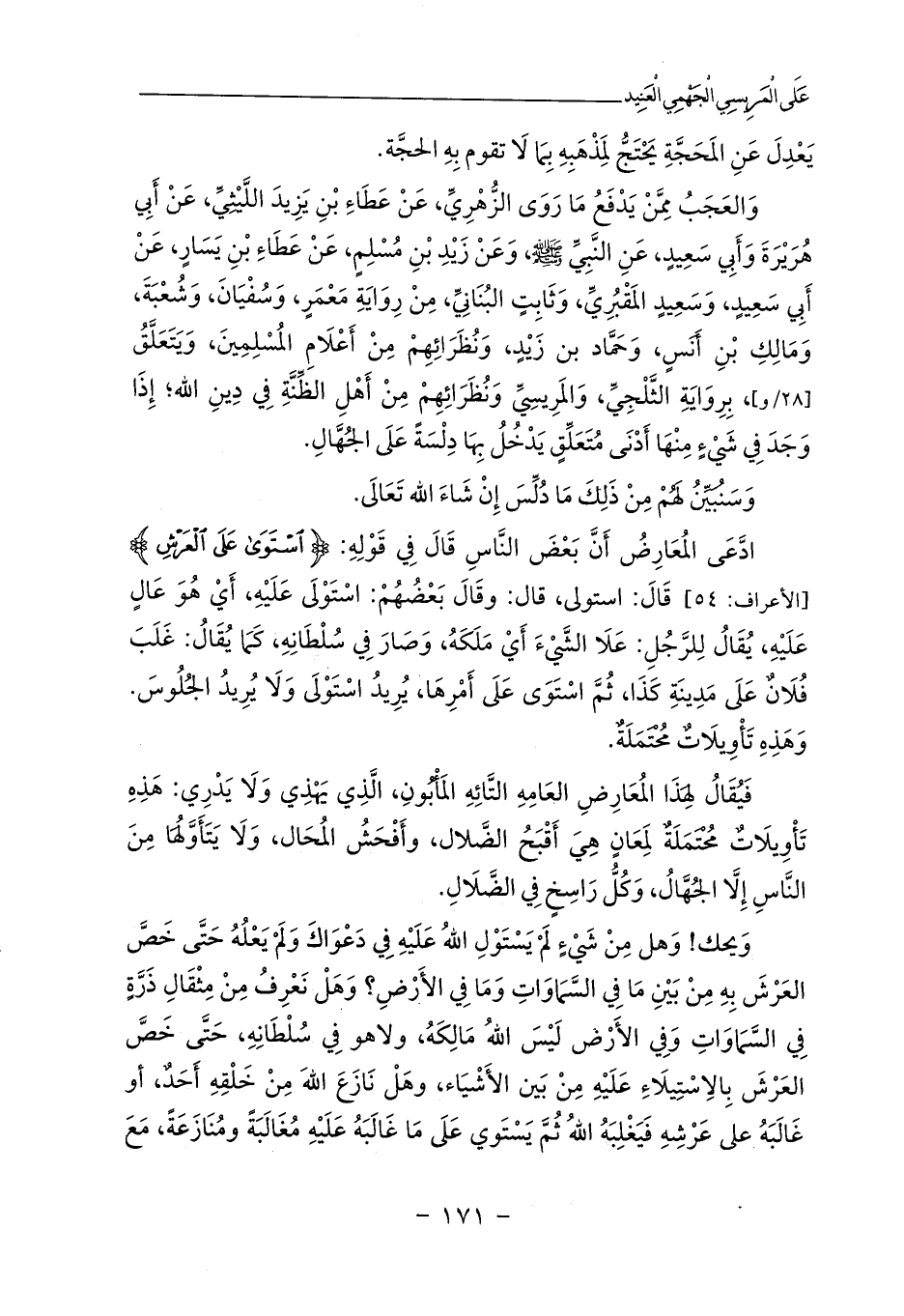 ادَّعَى المُعَارِضُ أَنَّ بَعْضَ النَّاسِ قَالَ فِي قَوْلِهِ: {اسْتَوَى عَلَى الْعَرْشِ} [الأعراف: 54] قَالَ: استولى، قال: وقَالَ بَعْضُهُمْ: اسْتَوْلَى عَلَيْهِ، أَيْ هُوَ عَالٍ عَلَيْهِ، يُقَالُ لِلرَّجُلِ: عَلَا الشَّيْءَ أَيْ مَلَكَهُ، وَصَارَ فِي سُلْطَانِهِ، كَمَا يُقَالُ: غَلَبَ فُلَانٌ عَلَى مَدِينَةِ كَذَا، ثُمَّ اسْتَوَى عَلَى أَمْرِهَا، يُرِيدُ اسْتَوْلَى وَلَا يُرِيدُ الجُلُوسَ. وَهَذِهِ تَأْوِيلَاتٌ مُحْتَمَلَةٌ.