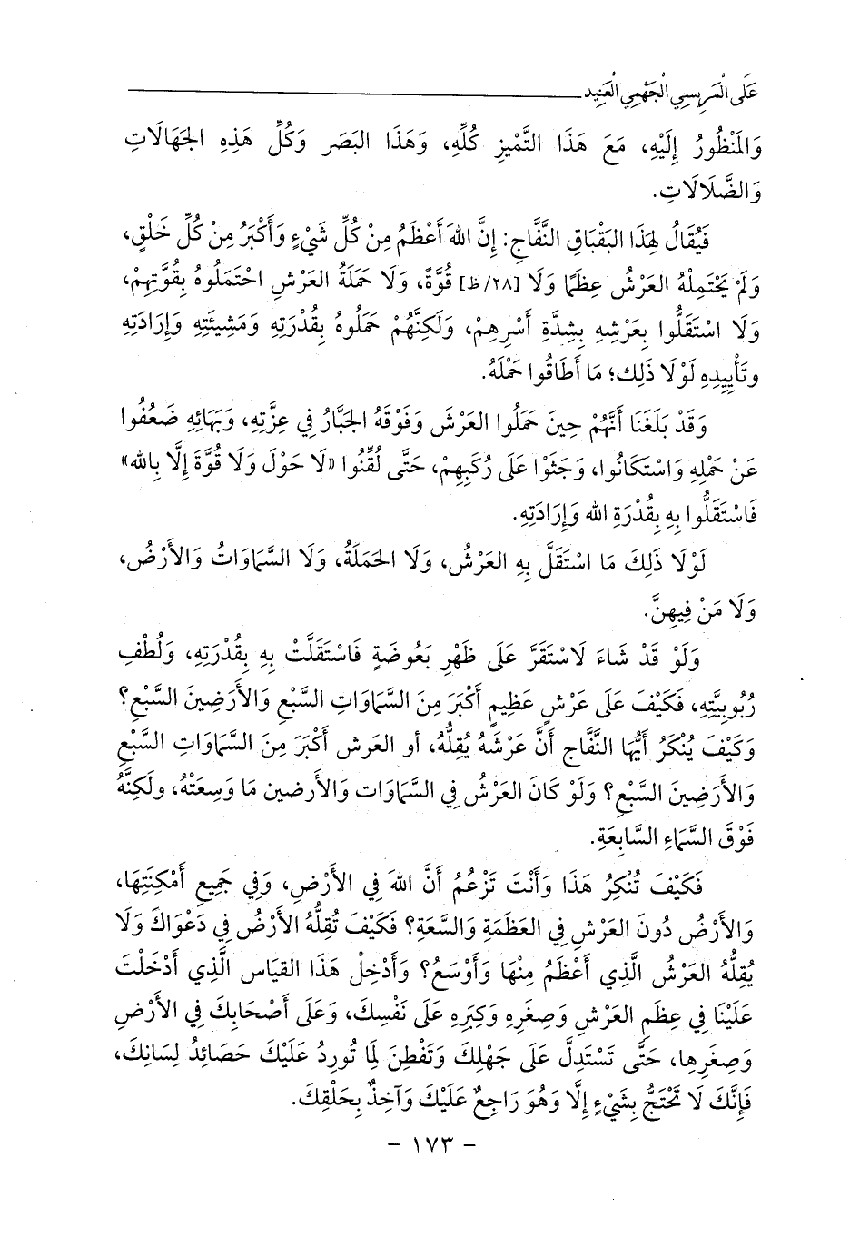 وَلَوْ قَدْ شَاءَ لَاسْتَقَرَّ عَلَى ظَهْرِ بَعُوضَةٍ فَاسْتَقَلَّتْ بِهِ بِقُدْرَتِهِ، وَلُطْفِ رُبُوبِيَّتِهِ، فَكَيْفَ عَلَى عَرْشٍ عَظِيمٍ أَكْبَرَ مِنَ السَّمَاوَاتِ السَّبْعِ وَالأَرَضِينَ السَّبْعِ؟ وَكَيْفَ يُنْكَرُ أَيُّهَا النَّفَّاج أَنَّ عَرْشَهُ يُقِلُّهُ، أو العَرش أَكْبَرَ مِنَ السَّمَاوَاتِ السَّبْعِ وَالأَرَضِينَ السَّبْعِ؟ وَلَوْ كَانَ العَرْشُ فِي السَّمَاوَات وَالأَرضين مَا وَسِعَتْهُ، ولَكِنَّهُ فَوْقَ السَّمَاءِ السَّابِعَةِ.