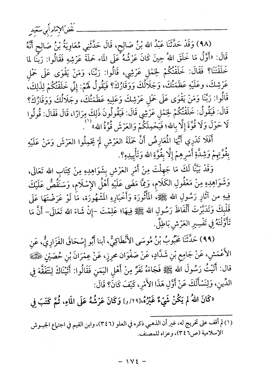 (98) وَقَدْ حَدَّثَنَا عَبْدُ الله بْنُ صَالِحٍ، قَالَ حَدَّثَنِي مُعَاوِيَةُ بْنُ صَالِحٍ أَنَّهُ قَالَ: «أَوَّلُ مَا خَلَقَ اللهُ حِينَ كَانَ عَرْشُهُ عَلَى المَاء حَملَةَ عَرْشِهِ فَقَالُوا: رَبنَا لما خَلَقْتَنَا؟ فَقَالَ: خَلَقْتُكُمْ لِحَمْلِ عَرْشِي, قَالُوا: رَبَّنَا، وَمَنْ يَقْوَى عَلَى حَمْلِ عَرْشِكَ، وعَلَيْهِ عَظَمَتُكَ، وَجَلَالُكَ وَوَقَارُكَ؟ فَيَقُولُ لَهُمْ: إِنِّي خَلَقْتُكُمْ لِذَلِكَ، قَالُوا: رَبَّنَا وَمَنْ يَقْوَى عَلَى حَمْلِ عَرْشِكَ وَعَلِيهِ عَظَمَتُكَ، وجَلَالُكَ وَوَقَارُكَ؟ قَالَ: فَيَقُولُ: خَلَقْتُكُمْ لِحَمْلِ عَرْشِي قَالَ: فَيَقُولُونَ ذَلِكَ مِرَارًا، قَالَ فَقَالَ: قُولُوا لَا حَوْلَ وَلَا قُوَّةَ إِلَّا بِالله؛ فَيَحْمِلَكُمْ وَالعَرْشَ قُوَّةُ الله» (¬1).