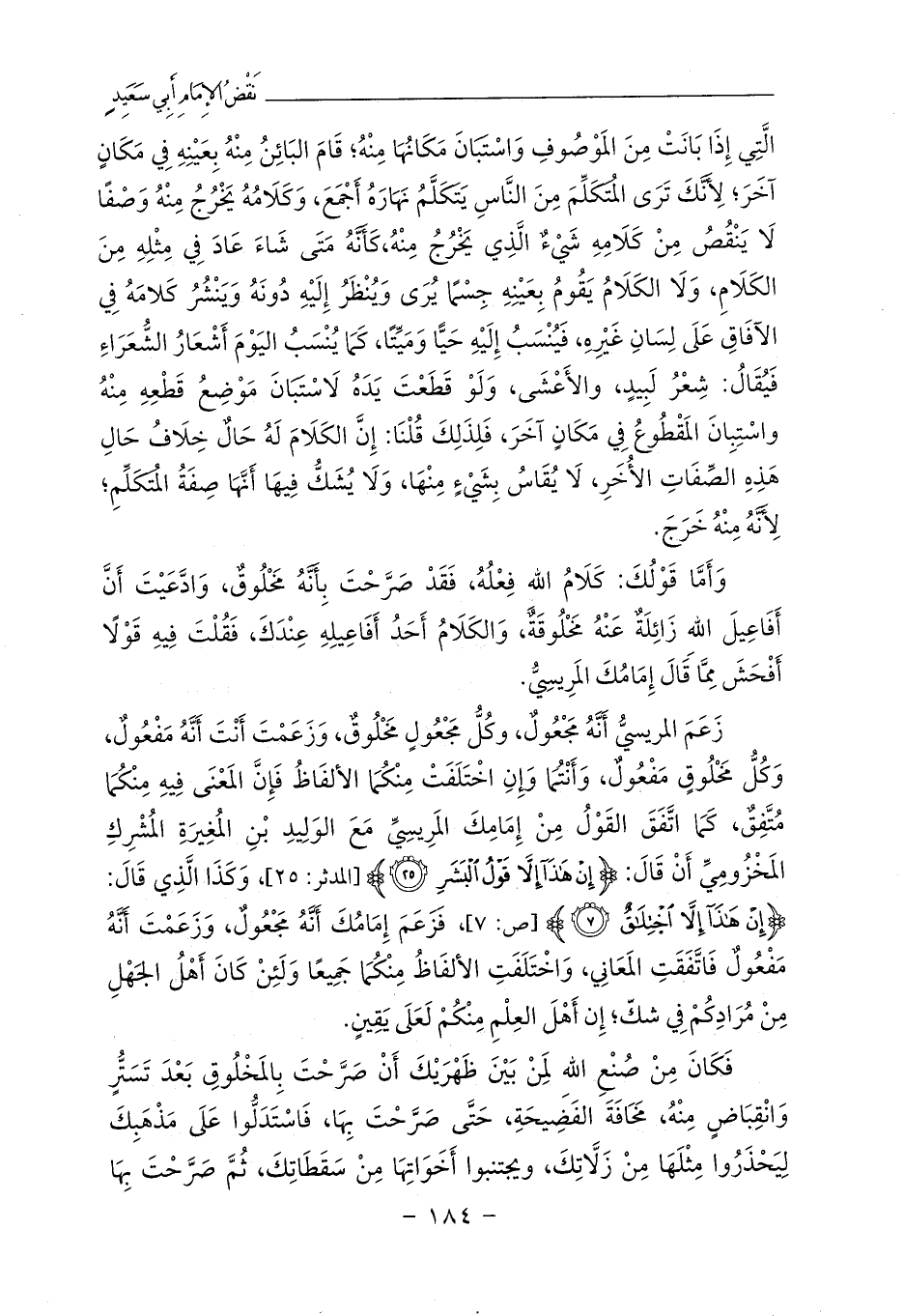 وَأَمَّا قَوْلُكَ: كَلَامُ اللهِ فِعْلُهُ، فَقَدْ صَرَّحْتَ بِأَنَّهُ مَخْلُوقٌ، وَادَّعَيْتَ أَنَّ أَفَاعِيلَ اللهِ زَائِلَةٌ عَنْهُ مَخْلُوقَةٌ، وَالكَلَامُ أَحَدُ أَفَاعِيلِهِ عِنْدَكَ، فَقُلْتَ فِيهِ قَوْلًا أَفْحَشَ مِمَّا قَالَ إِمَامُكَ المَرِيسِيُّ.