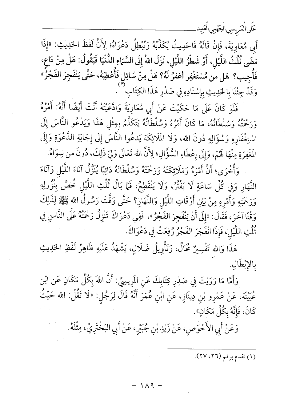 أَبِي مُعَاوِيَةَ، فَإِنْ قَالَهُ فَالحَدِيثُ يُكَذِّبُهُ وَيُبْطِلُ دَعْوَاهُ؛ لِأَنَّ لَفْظَ الحَدِيثِ: «إِذَا مَضَى ثُلُثُ اللَّيْلِ، أَوْ شَطْرُ اللَّيْلِ، نَزَلَ اللهُ إِلَى السَّمَاءِ الدُّنْيَا فَيَقُولُ: هَلْ مِنْ دَاعٍ، فَأُجِيب؟ هَل من مُسْتَغْفِر أغفرُ لَهُ؟ هَلْ مِنْ سَائِلٍ فَأُعْطِيَهُ، حَتَّى يَنْفَجِرَ الفَجْرُ» وَقَدْ جِئْنَا بِالحَدِيثِ بِإِسْنَادِهِ فِي صَدْرِ هَذَا الكِتَابِ (¬1).
