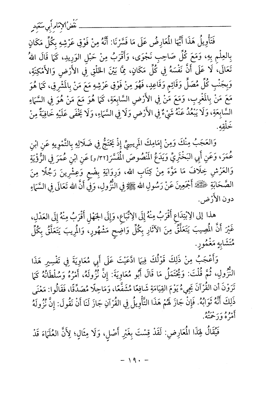 وَالعَجَبُ مِنْكَ وَمِنْ إِمَامِكَ المَرِيسِيِّ إِذْ يَحْتَجُّ فِي ضَلَالِهِ بِالتَّمْوِيهِ عَنِ ابْنِ عُمَرَ، وَعَنِ أَبِي البَخْتَرِيِّ وَيَدَعُ المَنْصُوصَ المُفَسَّرَ [32/و] عَنِ ابْنِ عُمَرَ فِي الرُّؤْيَةِ وَالعَرْشِ خِلَافَ مَا مَوَّهَ مِنْ كِتَابِ الله، وَرِوَايَةِ بِضْعٍ وَعِشْرِينَ رَجُلًا مِنَ الصَّحَابَةِ - رضي الله عنهم - أَجْمَعِينَ عَنْ رَسُولِ الله - صلى الله عليه وسلم - فِي النُّزُولِ، وَفِي أَنَّ الله تَعَالَى فِي السَّمَاءِ دون الأَرْض.