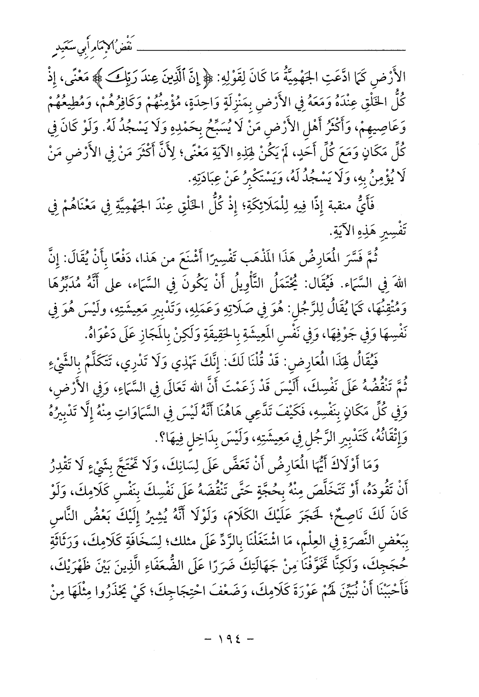 فَيُقَالُ لِهَذَا المُعَارِضِ: قَدْ قُلْنَا لَكَ: إِنَّكَ تَهْذِي وَلَا تَدْرِي، تَتَكَلَّمُ بِالشَّيْءِ ثُمَّ تَنْقُضُهُ عَلَى نَفْسِكَ، أَلَيْسَ قَدْ زَعَمْتَ أَنَّ الله تَعَالَى فِي السَّمَاءِ، وَفِي الأَرْضِ، وَفِي كُلِّ مَكَانٍ بِنَفْسِهِ، فَكَيْفَ تَدَّعِي هَاهُنَا أَنَّهُ لَيْسَ فِي السَّمَاوَاتِ مِنْهُ إِلَّا تَدْبِيرُهُ وَإِتْقَانُهُ، كَتَدْبِيرِ الرَّجُلِ فِي مَعِيشَتِهِ، وَلَيْسَ بِدَاخِلٍ فِيهَا؟.