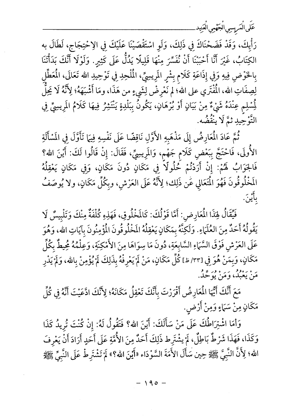 ثُمَّ عَادَ المُعَارِضُ إِلَى مَذْهَبِهِ الأَوَّلِ نَاقِضًا عَلَى نَفْسِهِ فِيمَا تَأَوَّلَ فِي المَسْأَلَةِ الأُولَى، فَاحْتَجَّ بِبَعْضِ كَلَامِ جَهْمٍ، وَالمَرِيسِيِّ، فَقَالَ: إِنْ قَالُوا لَكَ: أَيْنَ الله؟ فَالجَوَابُ لَهُمْ: إِنْ أَرَدْتُمْ حُلُولًا فِي مَكَانٍ دُونَ مَكَانٍ، وَفِي مَكَانٍ يَعْقِلُهُ المَخْلُوقُونَ فَهُوَ المُتَعَالِي عَن ذَلِك؛ لِأَنَّهُ عَلَى العَرْشِ، وبِكُلِّ مَكَانٍ، ولا يُوصَفُ بِأَيْنَ.