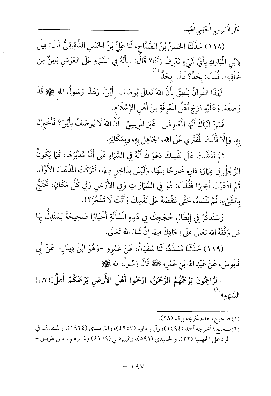 (118) حَدَّثَنَا الحَسَنُ بْنُ الصَّبَّاحِ، ثَنَا عَلِيُّ بْنُ الحَسَنِ الشَّقِيقِيُّ قَالَ: قِيلَ لِابْنِ المُبَارَكِ بِأَيِّ شَيْءٍ نَعْرِفُ رَبَّنَا؟ قَالَ: «بِأَنَّهُ فِي السَّمَاءِ عَلَى العَرْشِ بَائِنٌ مِنْ خَلْقِهِ». قُلْتُ: بِحَدٍّ؟ قَالَ: بِحَدٍّ (¬1).