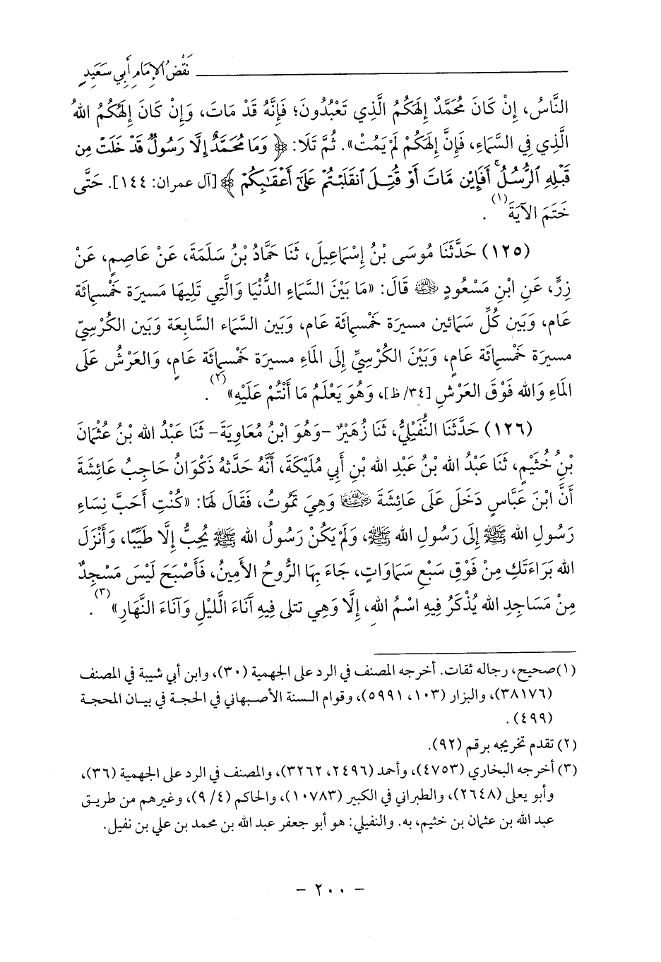 (125) حَدَّثَنَا مُوسَى بْنُ إِسْمَاعِيلَ، ثَنَا حَمَّادُ بْنُ سَلَمَةَ، عَنْ عَاصِمٍ، عَنْ زِرٍّ، عَنِ ابْنِ مَسْعُودٍ - رضي الله عنه - قَالَ: «مَا بَيْنَ السَّمَاءِ الدُّنْيَا وَالَّتِي تَلِيهَا مَسيرَة خَمْسمِائَة عَام، وَبَين كُلِّ سَمَائين مسيرَة خَمْسمِائَة عَام، وَبَين السَّمَاء السَّابِعَة وَبَين الكُرْسِيّ مسيرَة خَمْسمِائَة عَامٍ، وَبَيْنَ الكُرْسِيِّ إِلَى المَاءِ مسيرَة خَمْسمِائَة عَامٍ، وَالعَرْشُ عَلَى المَاءِ وَالله فَوْقَ العَرْشِ [34/ظ]، وَهُوَ يَعْلَمُ مَا أَنْتُمْ عَلَيْهِ» (¬2).