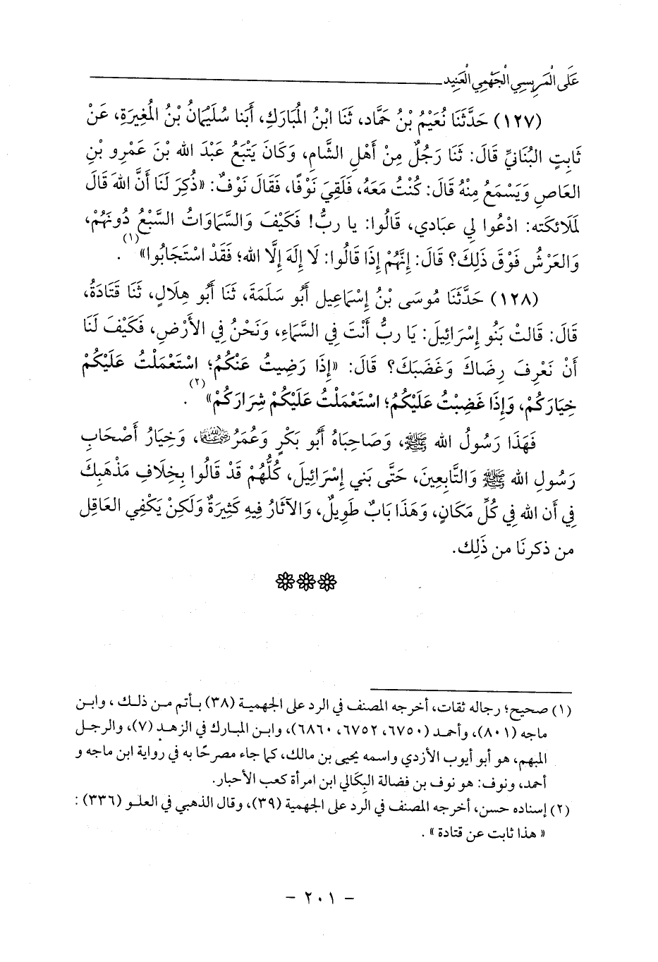 (127) حَدَّثَنَا نُعَيْمُ بْنُ حَمَّاد، ثَنَا ابْنُ المُبَارَكِ، أَبَنا سُلَيْمَانُ بْنُ المُغِيرَةِ، عَنْ ثَابِتٍ البُنَانيِّ قَالَ: ثَنَا رَجُلٌ مِنْ أَهْلِ الشَّامِ، وَكَانَ يَتْبَعُ عَبْدَ الله بْنَ عَمْرِو بْنِ العَاصِ وَيَسْمَعُ مِنْهُ قَالَ: كُنْتُ مَعَهُ، فَلَقِيَ نَوْفًا، فَقَالَ نَوْفٌ: «ذُكِرَ لَنَا أَنَّ اللهَ قَالَ لمَلَائكَته: ادْعُوا لِي عبَادي، قَالُوا: يا ربُّ! فَكَيْفَ وَالسَّمَاوَاتُ السَّبْعُ دُونَهُمْ، وَالعَرْشُ فَوْقَ ذَلِكَ؟ قَالَ: إِنَّهُمْ إِذَا قَالُوا: لَا إِلَهَ إِلَّا الله؛ فَقَدْ اسْتَجَابُوا» (¬1).