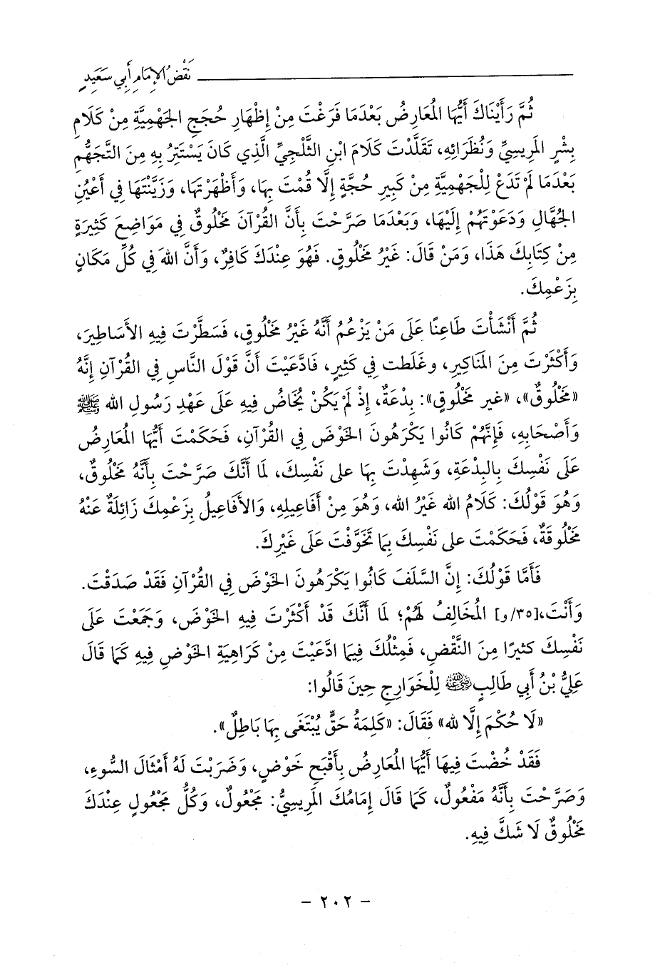 ثُمَّ رَأَيْنَاكَ أَيُّهَا المُعَارِضُ بَعْدَمَا فَرَغْتَ مِنْ إِظْهَارِ حُجَجِ الجَهْمِيَّةِ مِنْ كَلَامِ بِشْرٍ المَرِيسِيِّ وَنُظَرَائِهِ، تَقَلَّدْتَ كَلَامَ ابْنِ الثَّلْجِيِّ الَّذِي كَانَ يَسْتَتِرُ بِهِ مِنَ التَّجَهُّمِ بَعْدَمَا لَمْ تَدَعْ لِلْجَهْمِيَّةِ مِنْ كَبِيرِ حُجَّةٍ إِلَّا قُمْتَ بِهَا، وَأَظْهَرْتَهَا، وَزَيَّنْتَهَا فِي أَعْيُنِ الجُهَّالِ وَدَعَوْتَهُمْ إِلَيْهَا، وَبَعْدَمَا صَرَّحْتَ بِأَنَّ القُرْآنَ مَخْلُوقٌ فِي مَوَاضِعَ كَثِيرَةٍ مِنْ كِتَابِكَ هَذَا، وَمَنْ قَالَ: غَيْرُ مَخْلُوقٍ. فَهُوَ عِنْدَكَ كَافِرٌ، وَأَنَّ اللهَ فِي كُلِّ مَكَانٍ بِزَعْمِكَ.
