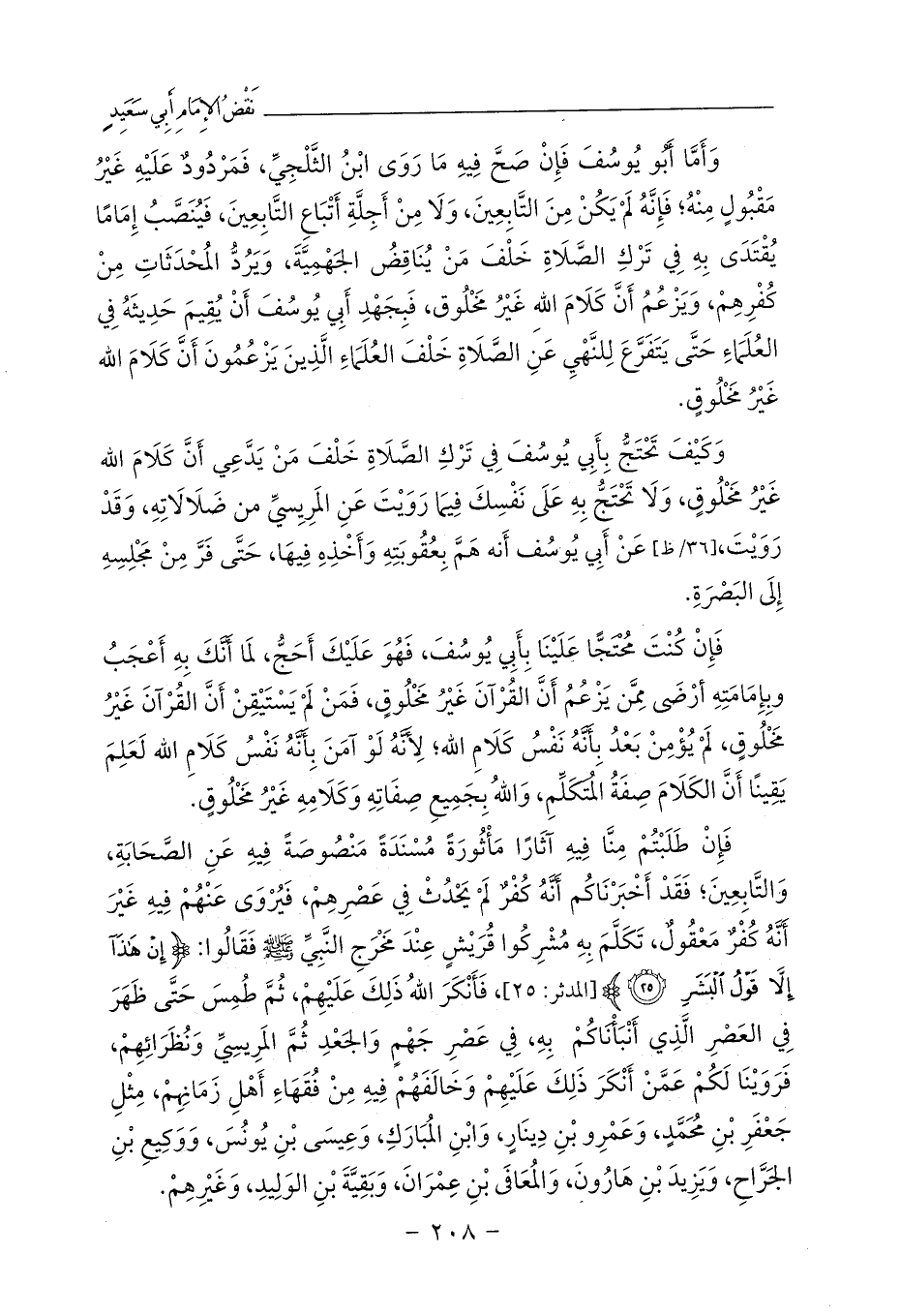 فَإِنْ كُنْتَ مُحْتَجًّا عَلَيْنَا بِأَبِي يُوسُفَ، فَهُوَ عَلَيْكَ أَحَجُّ، لَمَا أَنَّكَ بِهِ أَعْجَبُ وبِإِمَامَتِهِ أرْضَى مِمَّن يَزْعُمُ أَنَّ القُرْآنَ غَيْرُ مَخْلُوقٍ، فَمَنْ لَمْ يَسْتَيْقِنْ أَنَّ القُرْآنَ غَيْرُ مَخْلُوقٍ، لَمْ يُؤْمِنْ بَعْدُ بِأَنَّهُ نَفْسُ كَلَامِ الله؛ لِأَنَّهُ لَوْ آمَنَ بِأَنَّهُ نَفْسُ كَلَامِ الله لَعَلِمَ يَقِينًا أَنَّ الكَلَامَ صِفَةُ المُتَكَلِّمِ، وَاللهُ بِجَمِيعِ صِفَاتِهِ وَكَلَامِهِ غَيْرُ مَخْلُوقٍ.