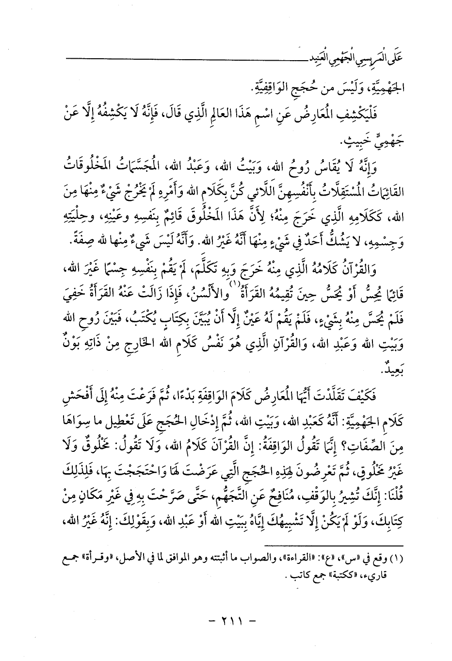 فَكَيْفَ تَقَلَّدْتَ أَيُّهَا المُعَارِضُ كَلَامَ الوَاقِفَةِ بَدْءًا، ثُمَّ فَرَعْتَ مِنْهُ إِلَى أَفْحَشِ كَلَامِ الجَهْمِيَّةِ: أَنَّهُ كَعَبْدِ الله، وَبَيْتِ الله، ثُمَّ إِدْخَالِ الحُجَجِ عَلَى تَعْطِيل ما سِوَاهَا مِنَ الصِّفَاتِ؟ إِنَّمَا تَقُولُ الوَاقِفَةُ: إِنَّ القُرْآنَ كَلَامُ الله، وَلَا تَقُولُ: مَخْلُوقٌ وَلَا غَيْرُ مَخْلُوقٍ، ثُمَّ تَعْرِضُونَ لِهَذِهِ الحُجَجِ الَّتِي عَرَضْتَ لَهَا وَاحْتَجَجْتَ بِهَا، فَلِذَلِكَ قُلْنَا: إِنَّكَ تُشِيرُ بِالوَقْفِ، مُنَافِحٌ عَنِ التَّجَهُّمِ، حَتَّى صَرَّحْتَ بِهِ فِي غَيْرِ مَكَانٍ مِنْ كِتَابِكَ، وَلَوْ لَمْ يَكُنْ إِلَّا تَشْبِيهُكَ إِيَّاهُ بِبَيْتِ الله أَوْ عَبْدِ الله، وَبِقَوْلِكَ: إِنَّهُ غَيْرُ الله،