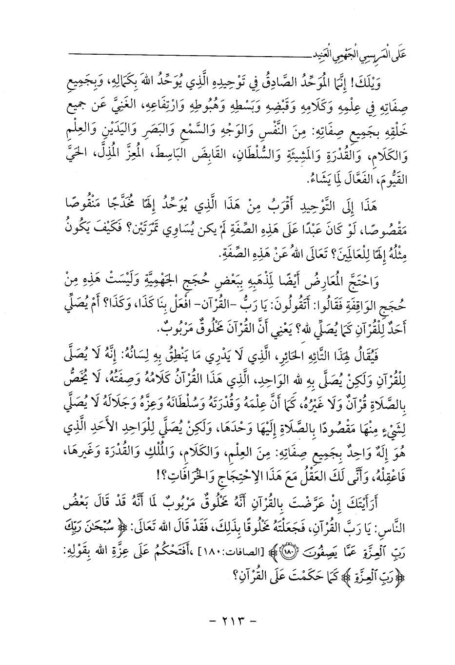 فَيُقَالُ لِهَذَا التَّائِهِ الحَائِرِ، الَّذِي لَا يَدْرِي مَا يَنْطِقُ بِهِ لِسَانُهُ: إِنَّهُ لَا يُصَلَّى لِلْقُرْآنِ وَلَكِنْ يُصَلَّى بِهِ للهِ الوَاحِدِ، الَّذِي هَذَا القُرْآنُ كَلَامُهُ وَصِفَتُهُ، لَا يُخَصُّ بِالصَّلَاةِ قُرْآنٌ وَلَا غَيْرُهُ، كَمَا أَنَّ عِلْمَهُ وَقُدْرَتَهُ وَسُلْطَانَهُ وَعِزَّهُ وَجَلَالَهُ لَا يُصَلَّي لِشَيْءٍ مِنْهَا مَقْصُودًا بِالصَّلَاةِ إِلَيْهَا وَحْدَهَا، وَلَكِنْ يُصَلَّي لِلْوَاحِدِ الأَحَدِ الَّذِي هُوَ إِلَهٌ وَاحِدٌ بِجَمِيعِ صِفَاتِهِ: مِنَ العِلْمِ، وَالكَلَامِ، وَالمُلْكِ وَالقُدْرَة وَغَيرهَا، فَاعْقِلْهُ، وَأَنَّى لَكَ العَقْلُ مَعَ هَذَا الِاحْتِجَاجِ وَالخُرَافَاتِ؟!