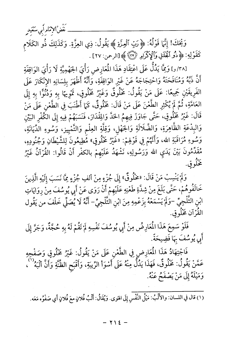 [38/و] وَمِمَّا يَدُلُّ عَلَى اعْتِقَادِ هَذَا المُعَارِضِ رَأْيَ الجَهْمِيَّةِ لَا رَأْيَ الوَاقِفَةِ أَنَّ ذَبَّهُ وَمُنَافَحَتَهُ وَاحْتِجَاجَهُ عَنْ غَيْرِ الوَاقِفَةِ، وَأَنَّهُ أَظْهَرَ بِلِسَانِهِ الإِنْكَارَ عَلَى الفَرِيقَيْنِ جَمِيعًا: عَلَى مَنْ يَقُولُ: مَخْلُوقٌ وَغَيْرُ مَخْلُوقٍ، تَمْوِيهًا بِهِ وَدُنُوًّا بِهِ إِلَى العَامَّةِ، ثُمَّ لَمْ يُكْثِرِ الطَّعْنَ عَلَى مَنْ قَالَ: مَخْلُوقٌ، كَمَا أَطْنَبَ فِي الطَّعْنِ عَلَى مَنْ قَالَ: غَيْرُ مَخْلُوقٍ، حَتَّى جَاوَزَ فِيهِمُ الحَدَّ وَالمِقْدَارَ، فَنَسَبَهُمْ فِيهِ إِلَى الكُفْرِ البَيِّنِ وَالبِدْعَةِ الظَّاهِرَةِ، وَالضَّلَالَةِ وَالجَهْلِ، وَقِلَّةِ العِلْمِ وَالتَّمْيِيز، وَسُوءِ الدِّيَانَةِ، وَسُوءِ مُرَاقَبَةِ الله، وَأَنَّهُمْ فِي قَوْلِهِمْ: «غَيْرُ مَخْلُوقٍ» مُطِيعُونَ لِلشَّيْطَانِ وَجُنُودِهِ، مُقَدِّمُونَ بَيْنَ يَدَيِ الله وَرَسُولِهِ، نَشْهَدُ عَلَيْهِمْ بالكفْر أَنْ قَالُوا: القُرْآنُ غَيْرُ مَخْلُوقٍ.