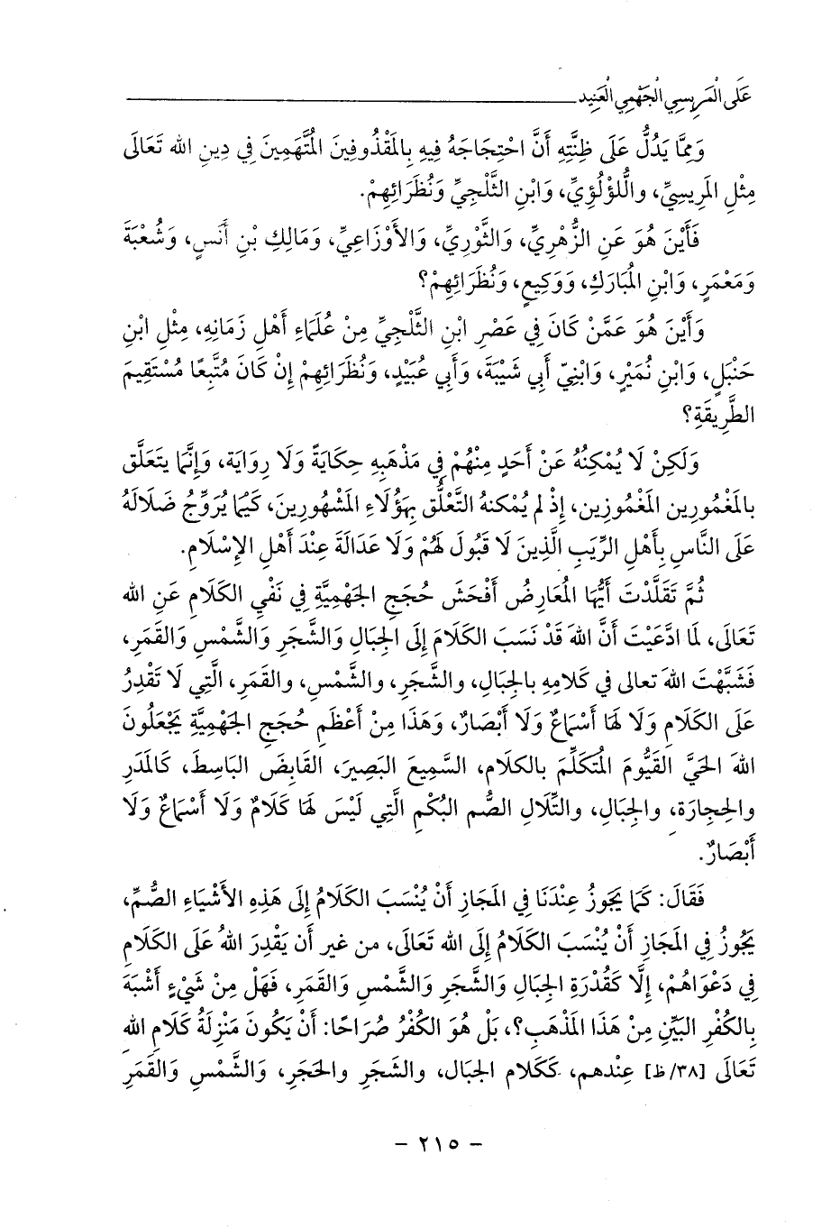 ثُمَّ تَقَلَّدْتَ أَيُّهَا المُعَارِضُ أَفْحَشَ حُجَجِ الجَهْمِيَّةِ فِي نَفْيِ الكَلَامِ عَنِ الله تَعَالَى، لَمَا ادَّعَيْتَ أَنَّ اللهَ قَدْ نَسَبَ الكَلَامَ إِلَى الجِبَالِ وَالشَّجَرِ وَالشَّمْسِ وَالقَمَرِ، فَشَبَّهْتَ اللهَ تعالى في كَلامِهِ بالجِبَالِ، والشَّجَرِ، والشَّمْسِ، والقَمَرِ، الَّتِي لَا تَقْدِرُ عَلَى الكَلَامِ وَلَا لَهَا أَسْمَاعٌ وَلَا أَبْصَارٌ، وَهَذَا مِنْ أَعْظَمِ حُجَجِ الجَهْمِيَّةِ يَجْعَلُونَ اللهَ الحَيَّ القَيُّومَ المُتَكَلِّمَ بالكلَام، السَّمِيعَ البَصِيرَ، القَابِضَ البَاسِطَ، كَالمَدَرِ والِحجِارَة، والجِبَالِ، والتِّلَالِ الصُّم البُكْمِ الَّتِي لَيْسَ لَهَا كَلَامٌ وَلَا أَسْمَاعٌ وَلَا أَبْصَارٌ.