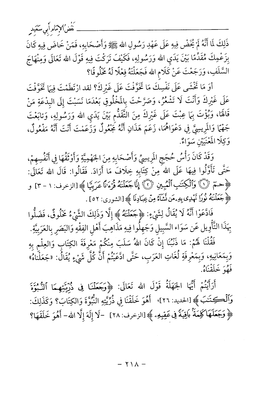 أوَ مَا تَخْشَى عَلَى نَفْسِكَ مَا تَخَوَّفْتَ عَلَى غَيْرِكَ؟ لقد ارْتَطَمْتَ فِيمَا تَخَوَّفْتَ عَلَى غَيْرِكَ وَأَنْتَ لَا تَشْعُرُ، وَصَرَّحْتَ بِالمَخْلُوقِ بَعْدَمَا نَسَبْتَ إِلَى البِدْعَةِ مَنْ قَالَهَا، وَبُؤْتَ بِمَا عِبْتَ عَلَى غَيْرِكَ مِنَ التَّقَدُّمِ بَيْنَ يَدَيِ الله وَرَسُولِهِ، وَتابَعْتَ جَهْمًا وَالمَرِيسِيَّ فِي دَعْوَاهُمَا، زَعَمَ هَذَانِ أَنَّهُ مَجْعُولٌ وَزَعَمْتَ أَنْتَ أَنَّهُ مَفْعُولٌ، وَكِلَا المَعْنَيَيْنِ سَوَاءٌ.