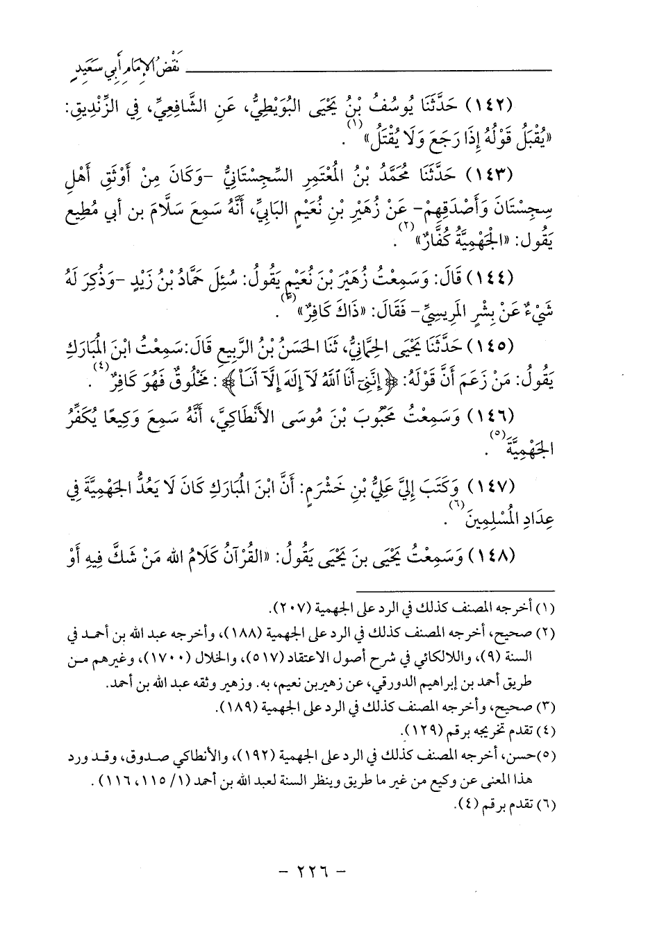 (143) حَدَّثَنَا مُحَمَّدُ بْنُ المُعْتَمِرِ السِّجِسْتَانِيُّ -وَكَانَ مِنْ أَوْثَقِ أَهْلِ سِجِسْتَانَ وَأَصْدَقِهِمْ- عَنْ زُهَيْرِ بْنِ نُعَيْمٍ البَابِيِّ، أَنَّهُ سَمِعَ سَلَّامَ بن أبي مُطِيع يَقُول: «الْجَهْمِيَّةُ كُفَّارٌ» (¬2).