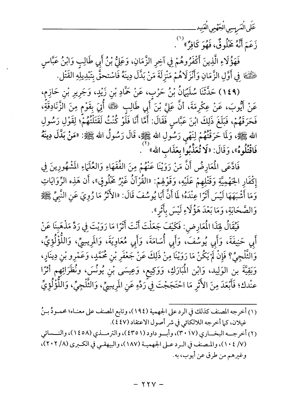 (149) حَدَّثَنَا سُلَيْمَانُ بْنُ حَرْبٍ، عَنْ حَمَّادِ بْنِ زَيْدٍ، وَجَرِيرِ بْنِ حَازِمٍ، عَنْ أَيُّوبَ، عَنْ عِكْرِمَةَ، أنَّ عَلِيَّ بْنَ أَبِي طَالِبٍ - رضي الله عنه - أُتِيَ بِقَوْمٍ مِنَ الزَّنَادِقَةِ، فَحَرَقَهُمْ، فَبَلَغَ ذَلِكَ ابْنَ عَبَّاسٍ فَقَالَ: أَمَّا أَنَا فَلَوْ كُنْتُ لَقَتَلْتُهُمْ؛ لِقَوْلِ رَسُولِ الله - صلى الله عليه وسلم -، وَلَمَا حَرَقْتُهُمْ لِنَهْيِ رَسُولِ الله - صلى الله عليه وسلم -، قَالَ رَسُولُ الله - صلى الله عليه وسلم -: «مَنْ بَدَّلَ دِينَهُ فَاقْتُلُوهُ»، وَقَالَ: «لَا تُعَذِّبُوا بِعَذَابِ الله» (¬2).
