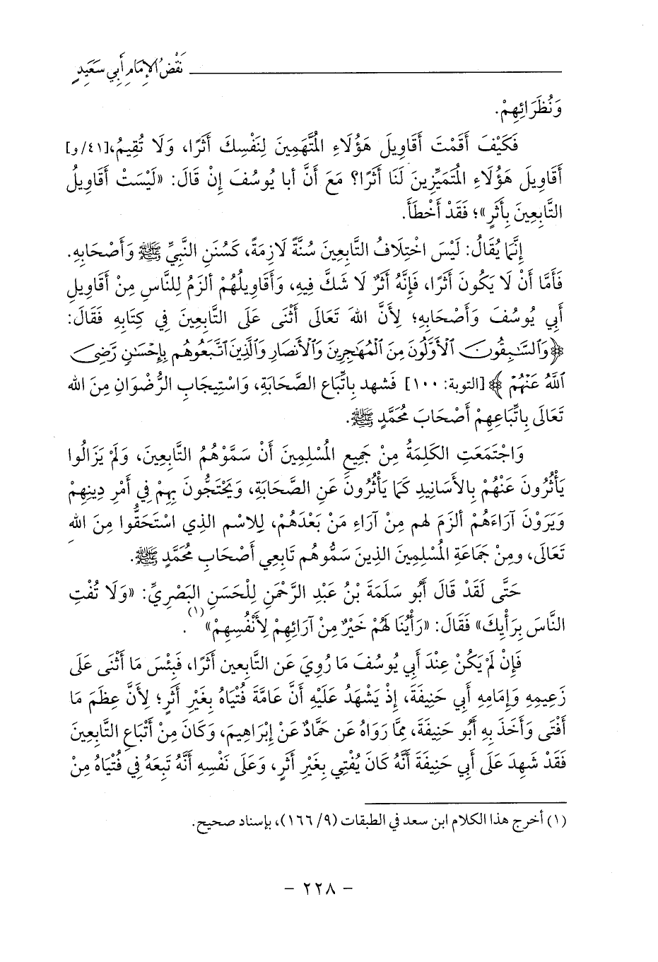 فَإِنْ لَمْ يَكُنْ عِنْدَ أَبِي يُوسُفَ مَا رُوِيَ عَن التَّابِعين أَثَرًا، فَبِئْسَ مَا أَثْنَى عَلَى زَعِيمِهِ وَإِمَامِهِ أَبِي حَنِيفَةَ، إِذْ يَشْهَدُ عَلَيْهِ أَنَّ عَامَّةَ فُتْيَاهُ بِغَيْرِ أَثَرٍ؛ لِأَنَّ عِظَمَ مَا أَفْتَى وَأَخَذَ بِهِ أَبُو حَنِيفَةَ، مِمَّا رَوَاهُ عَن حَمَّادٌ عَنْ إِبْرَاهِيمَ، وَكَانَ مِنْ أَتْبَاعِ التَّابِعِينَ فَقَدْ شَهِدَ عَلَى أَبِي حَنِيفَةَ أَنَّهُ كَانَ يُفْتِي بِغَيْرِ أَثَرٍ، وَعَلَى نَفْسِهِ أَنَّهُ تَبِعَهُ فِي فُتْيَاهُ مِنْ