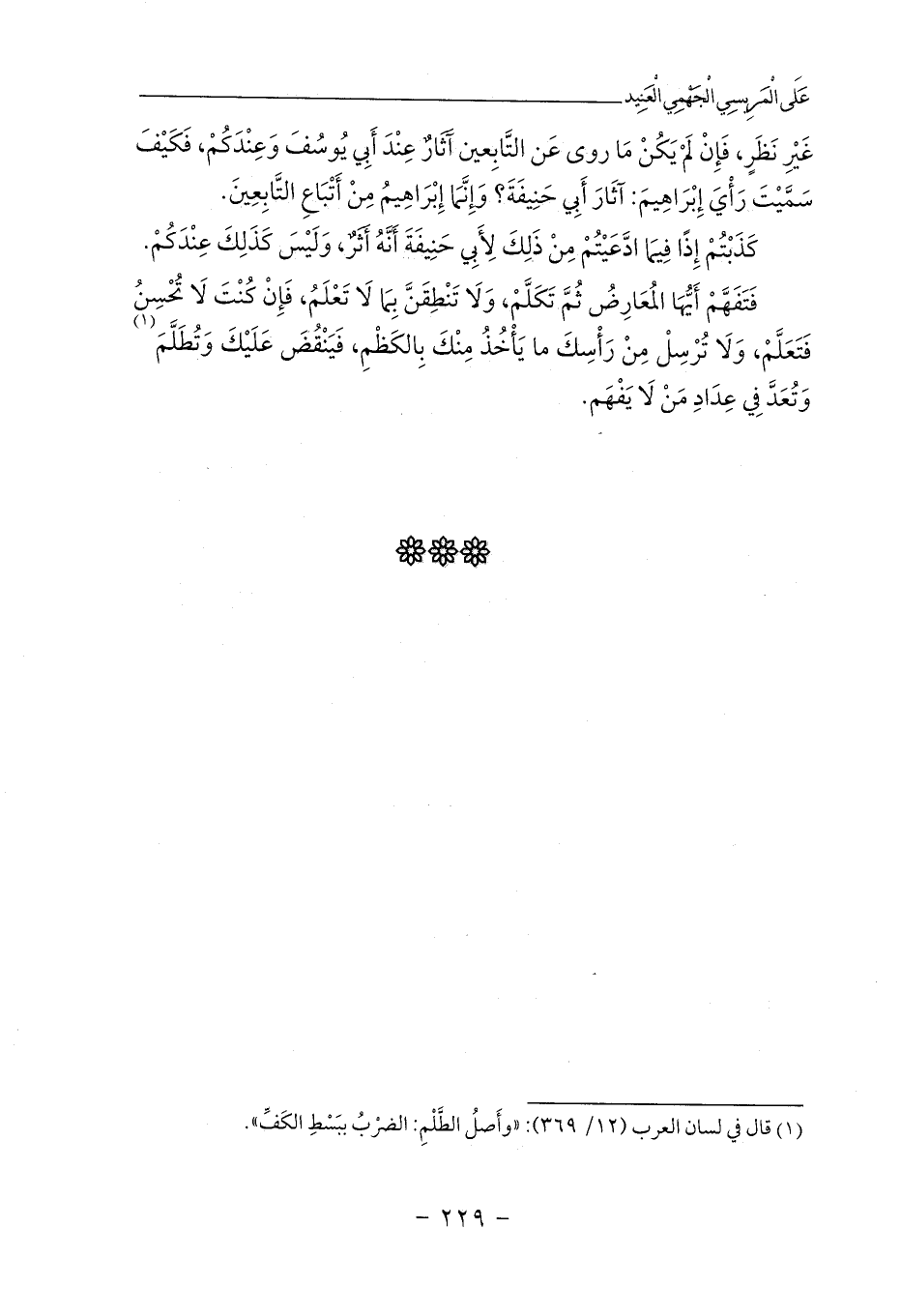 فَتَفَهَّمْ أَيُّهَا المُعَارِضُ ثُمَّ تَكَلَّمْ، وَلَا تَنْطِقَنَّ بِمَا لَا تَعْلَمُ، فَإِنْ كُنْتَ لَا تُحْسِنُ فَتَعَلَّمْ، وَلَا تُرْسِلْ مِنْ رَأْسِكَ ما يَأْخُذُ مِنْكَ بِالكَظْمِ، فَيَنْقُضَ عَلَيْكَ وَتُطَلَّمَ (¬1) وَتُعَدَّ فِي عِدَادِ مَنْ لَا يَفْهَم.